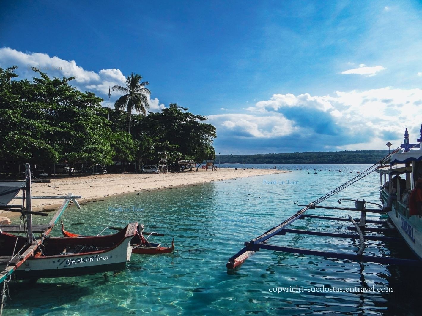 WasserTürkisblau, Kristallklar, Azurblau, Glitzernde Oberfläche, Sanfte WellenStrandWeißer Sand, Sanfter Bogen, Schattige Baumgrenze, Ruhiger UferbereichFloraÜppiges Grün, Dichte Belaubung, Kokospalmen, Tropischer BewuchsAtmosphäreUnberührte Schönheit, Sonnenschein, Entspannung, Sehnsucht, UrlaubsfeelingElementeTraditionelle Auslegerboote (Bangkas), Helle Wolkenformationen, Blauer Himmel