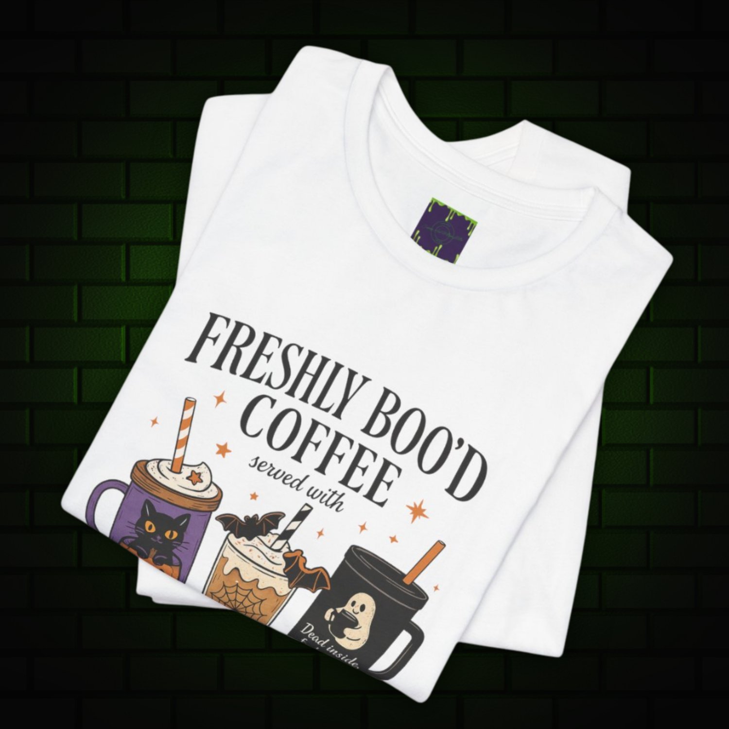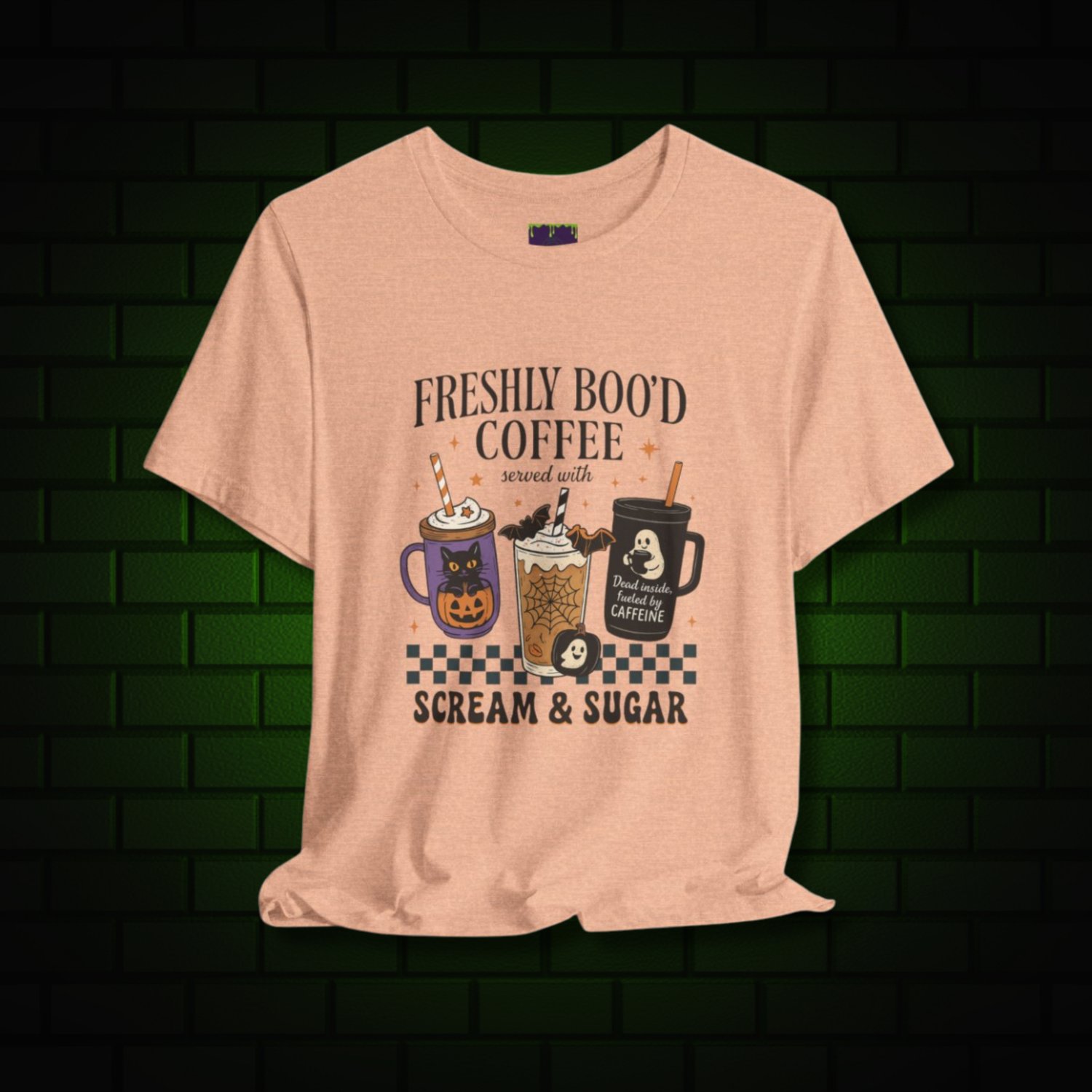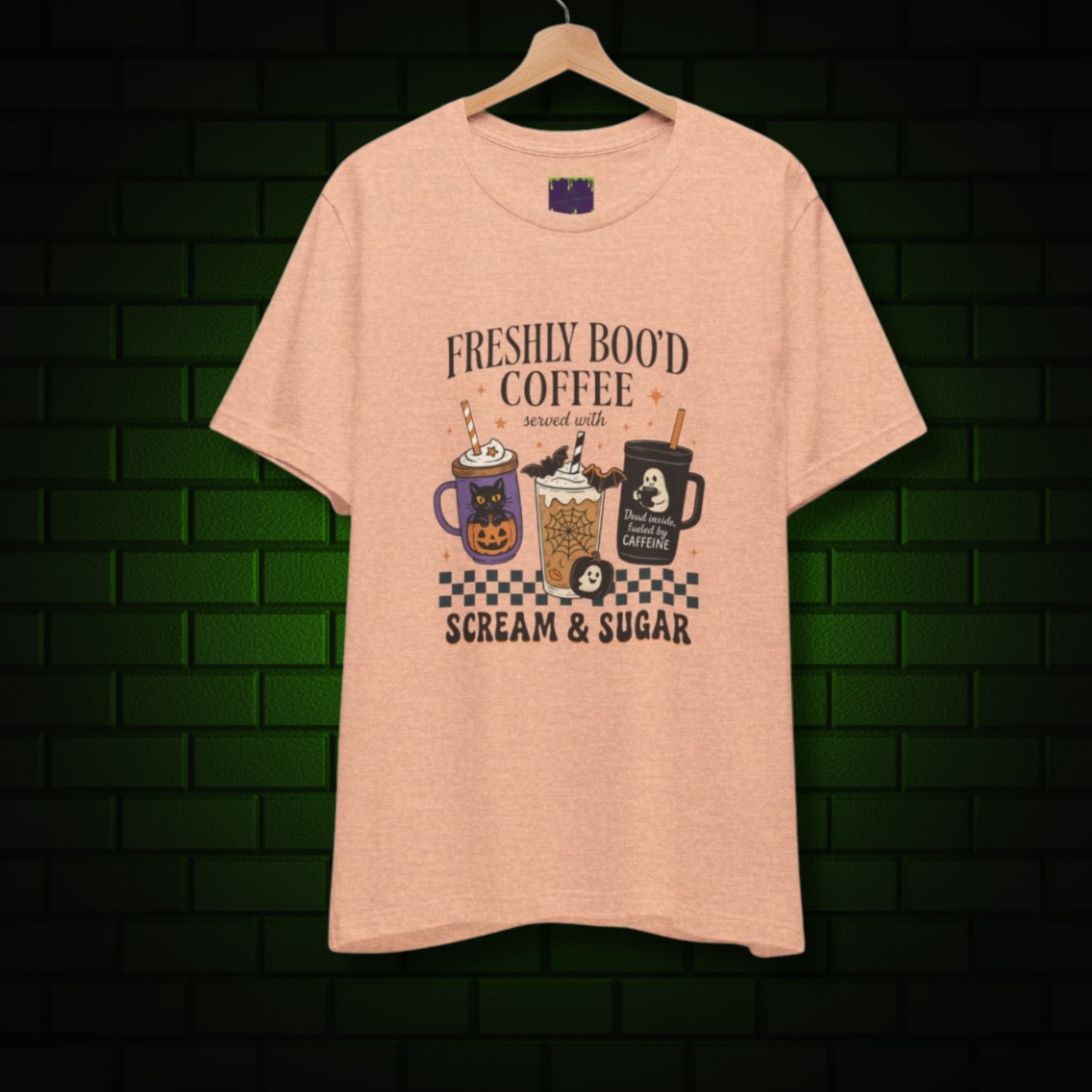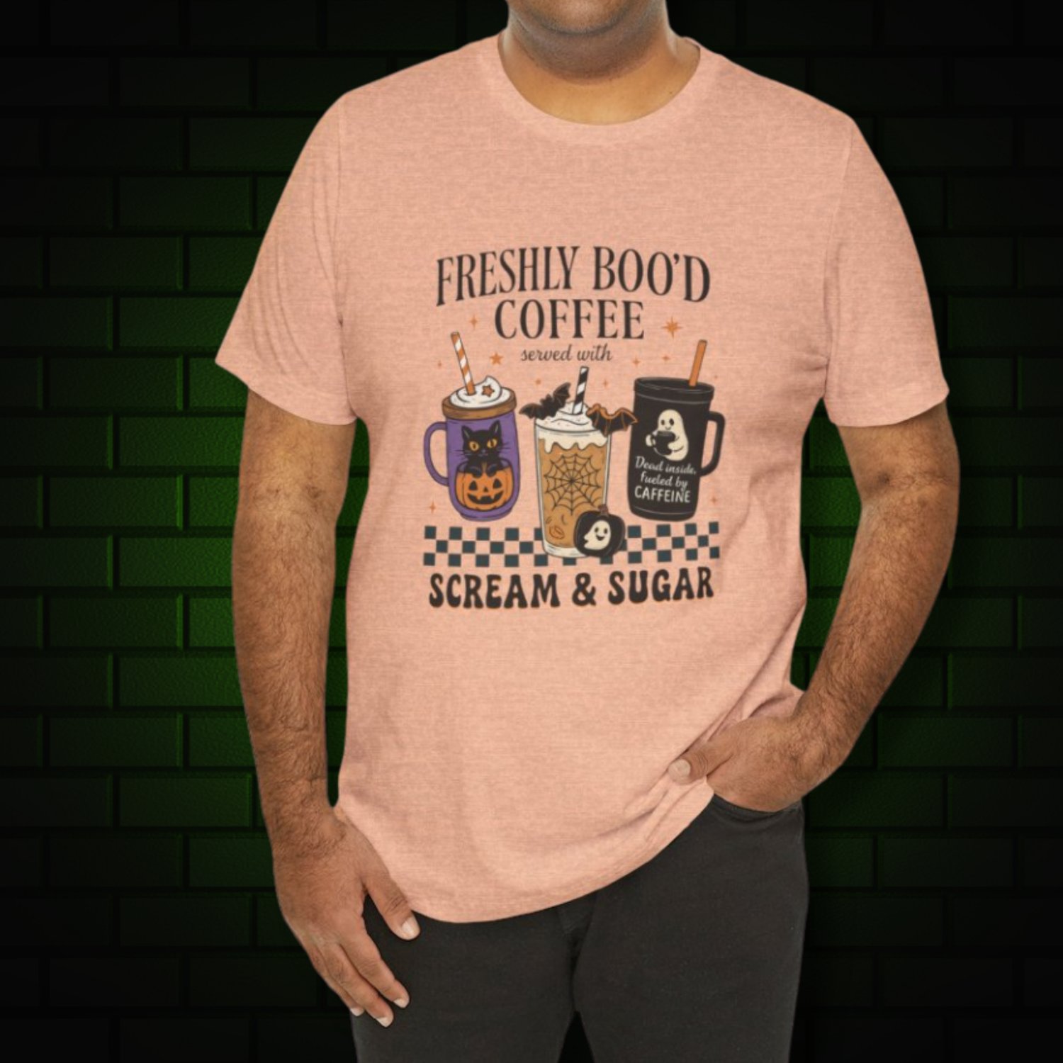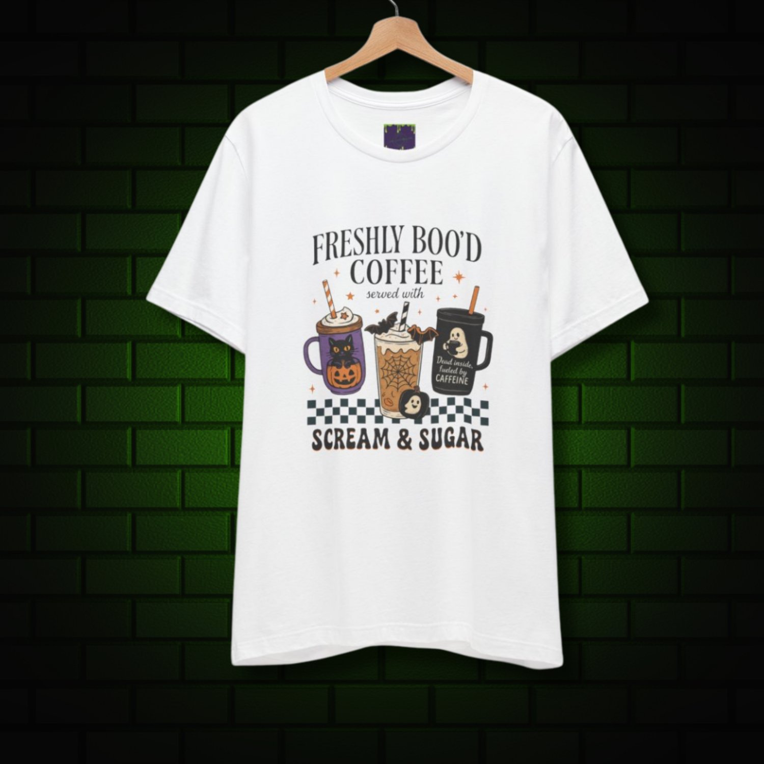 Start your mornings spooky-sweet with the Freshly Booed Coffee T-Shirt! Featuring an adorable ghost with coffee brewed from βscream & sugar,β this playful design is perfect for coffee lovers, Halloween fans, and anyone who likes their style with a touch of humor.
