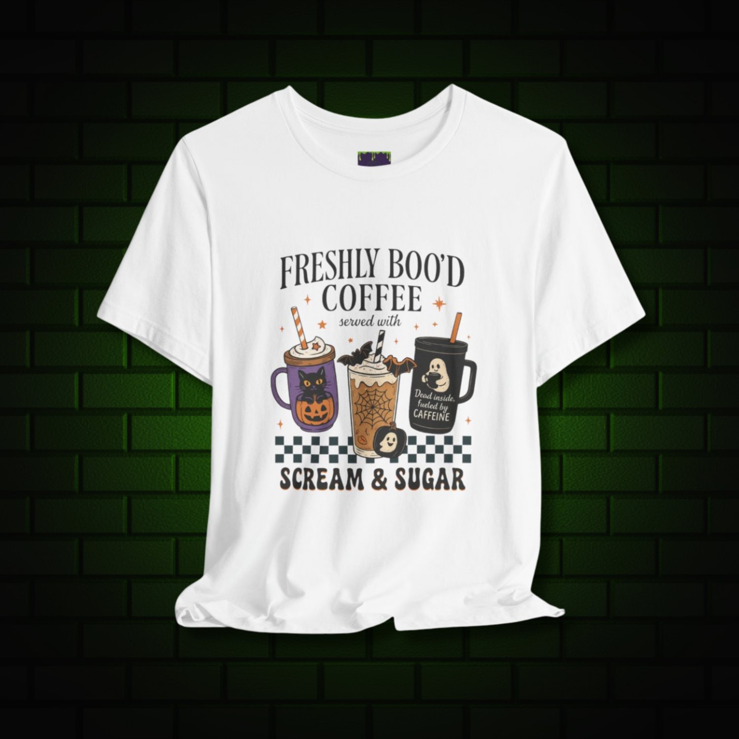 βπ» Freshly Booed Coffee T-Shirt β Cute Funny Halloween Ghost Tee with Scream & Suga