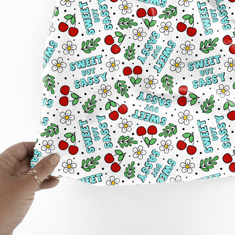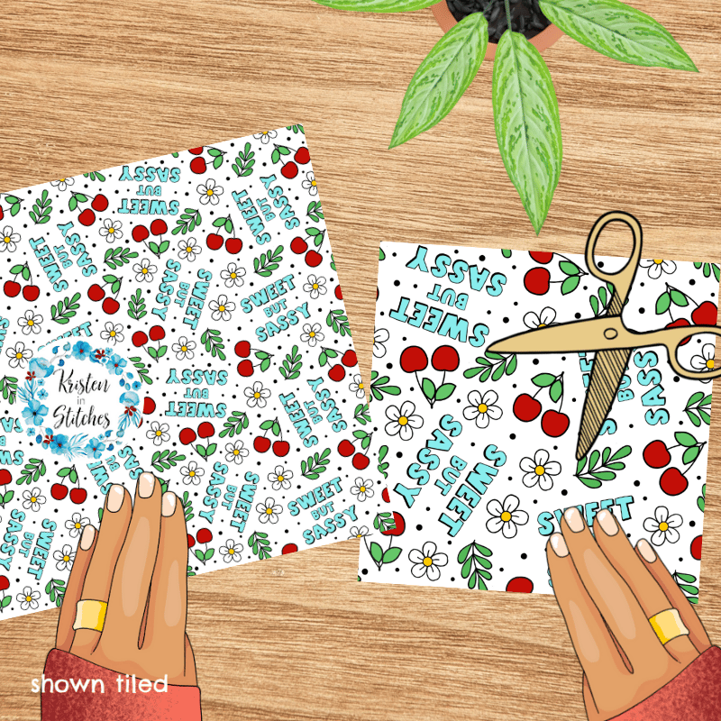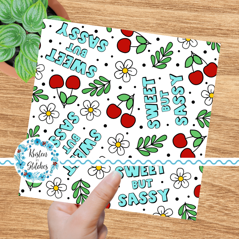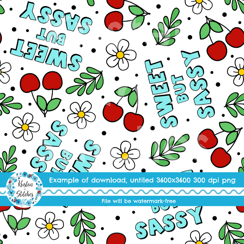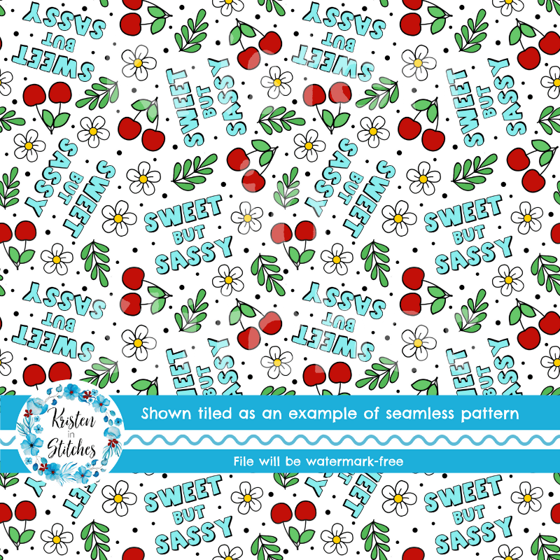 Sweet But Sassy seamless pattern with cherries and white daisy flowers.