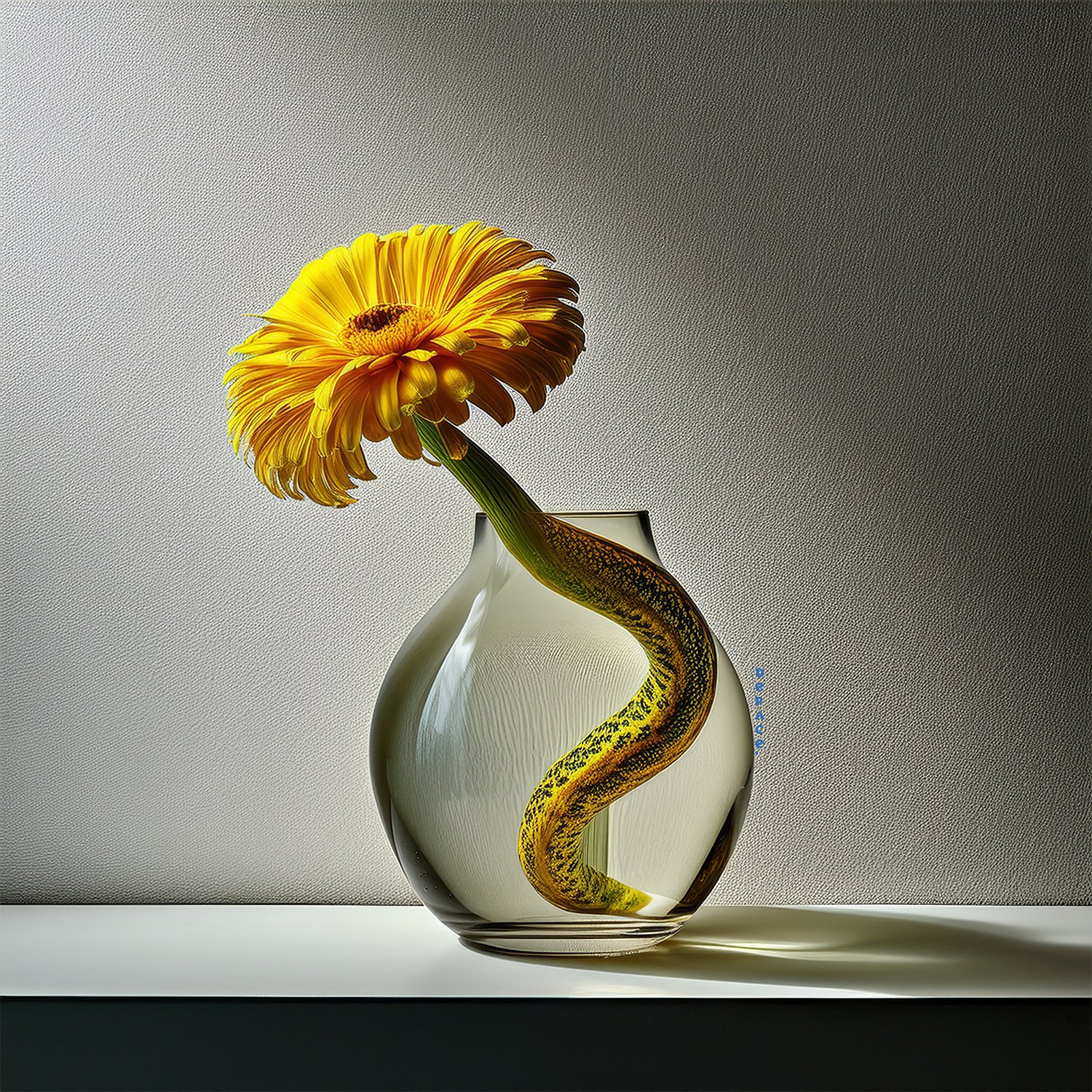 A single yellow snake flower stands quietly in a clear glass vase, bathed in the softness of morning light. The subtle shadows and muted textures create a calm, elegant still life — a study in simplicity and grace. Captured with a macro lens for delicate detail, this minimalist composition whispers serenity with every petal.