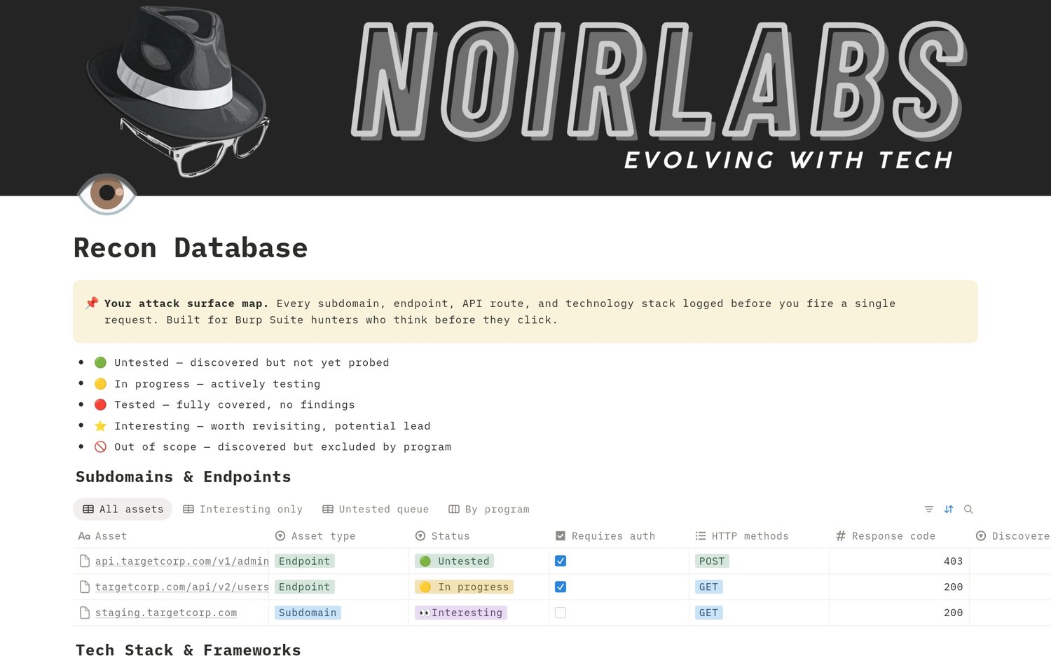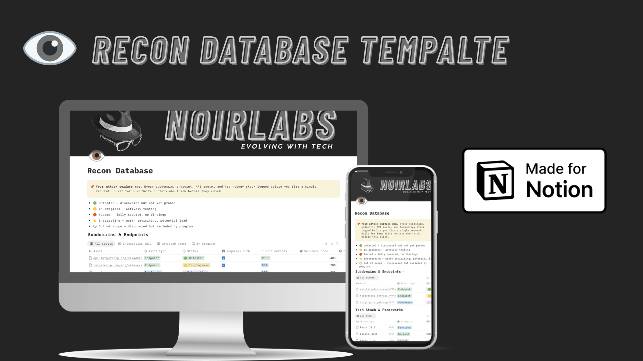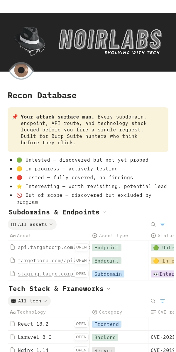 The Recon Database is the intelligence layer of Bug Bounty OS — a purpose-built Notion workspace that captures everything you discover about a target before you fire a single request.