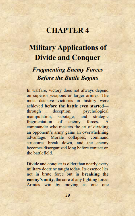 In a world defined by conflict, competition, and power struggles, the ability to fracture, manipulate, and dominate has long been the hidden key to success. Divide and Conquer offers an unflinching exploration of this age-old strategy, revealing how it shapes human behavior, politics, economies, militaries, and nations.