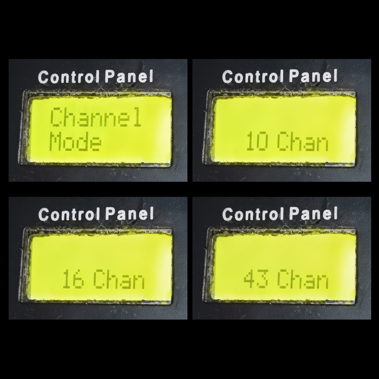 * Verifique, desde el display del equipo, que el menú "Channel Mode" muestre: "10 Chan", "16 Chan" y "43 Chan" (cuarta foto).