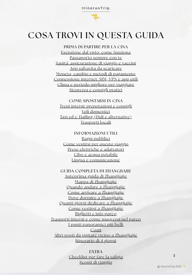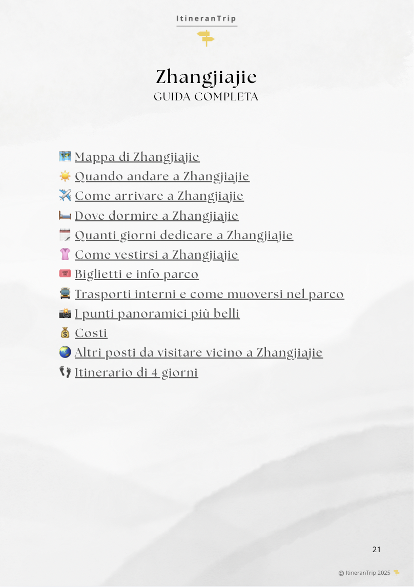 Questa guida digitale di oltre 40 pagine nasce dalla mia esperienza diretta a Zhangjiajie ed è pensata per aiutarti a organizzare in autonomia un viaggio indimenticabile nel parco che ha ispirato le montagne fluttuanti di Avatar.