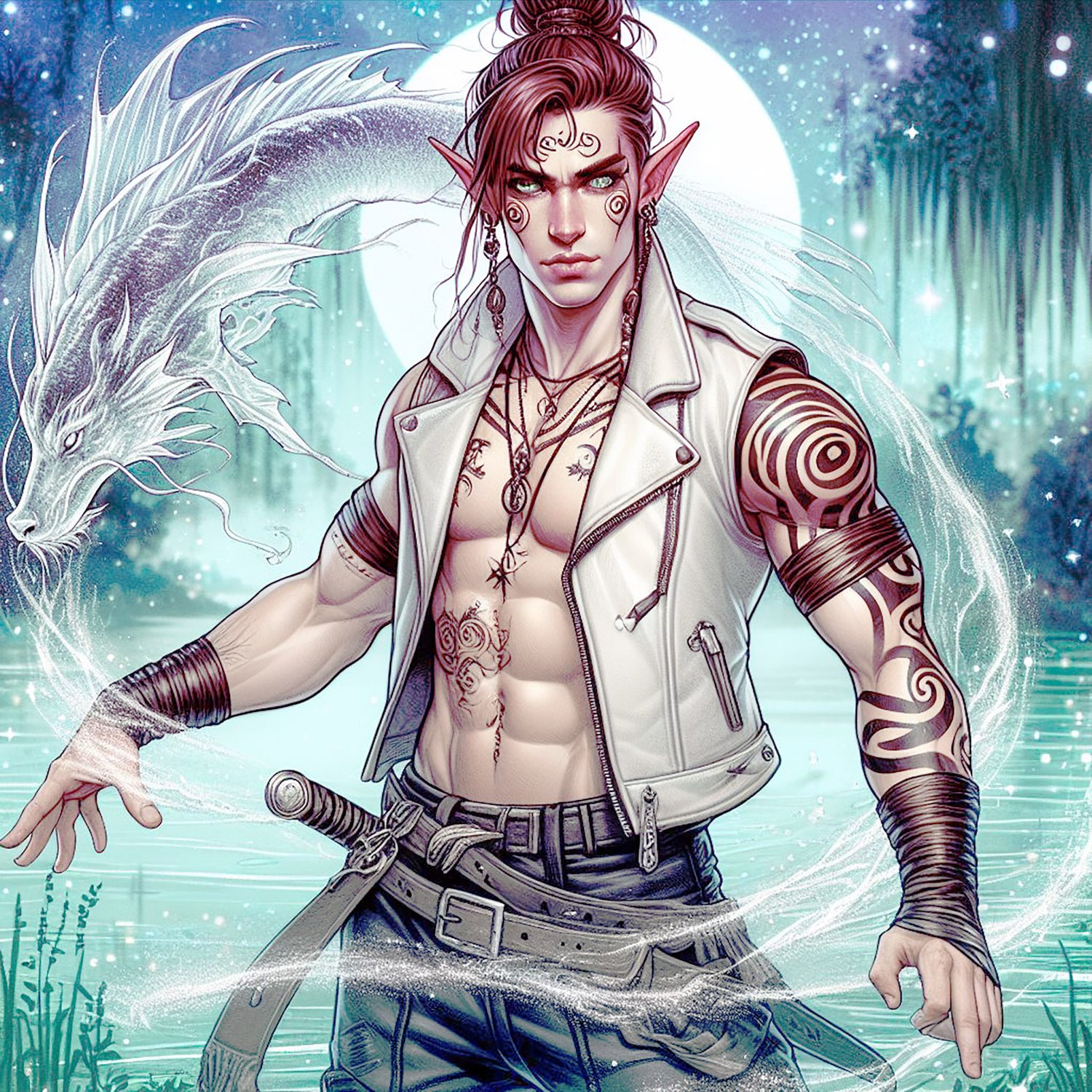 A Male Elf kneels in a Magical Lake after summoning a translucent Sea Dragon 3
