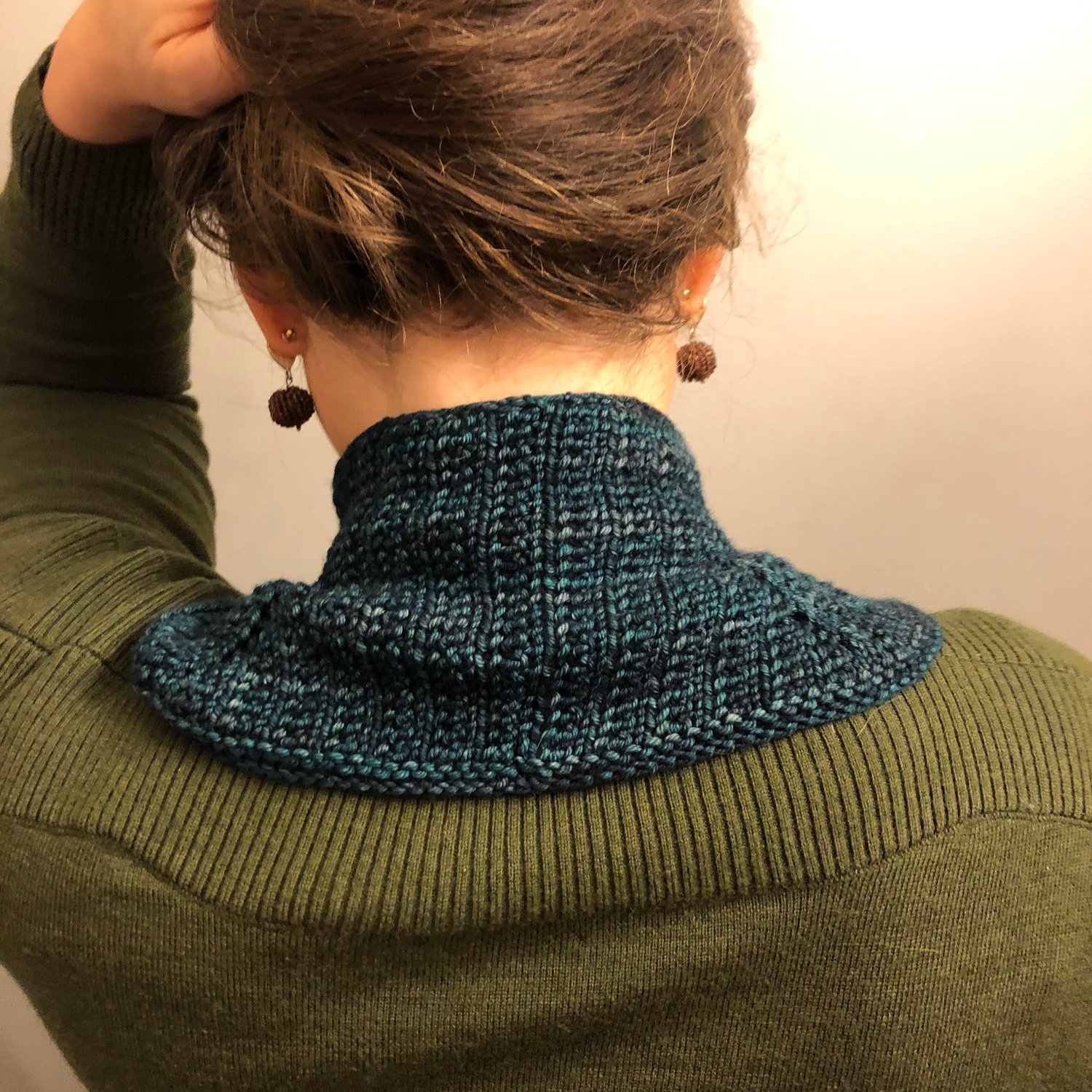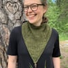 This cozy polo/cowl is worked top-down in the round, using circular needles. The circumference is gradually increased by yarn-overs in a raglan shape. The front V is worked flat and the edging is finally added in the round. Beads can be added as an extra embellishment after blocking. They will also help keeping the polo in place.