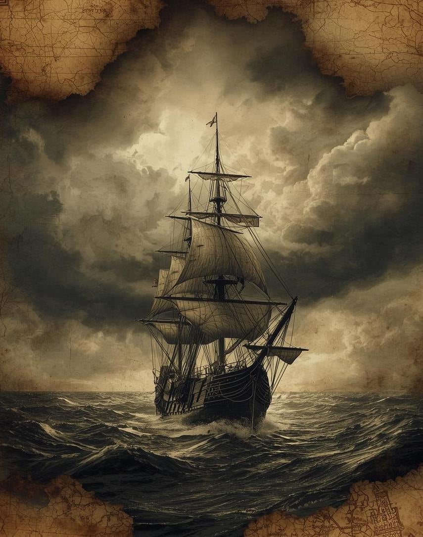 Majestatyczny żaglowiec sunący po otwartym morzu, osadzony na tle antycznej mapy, oddaje ducha podróży, wolności i odwagi.