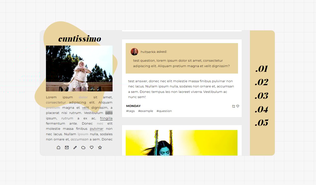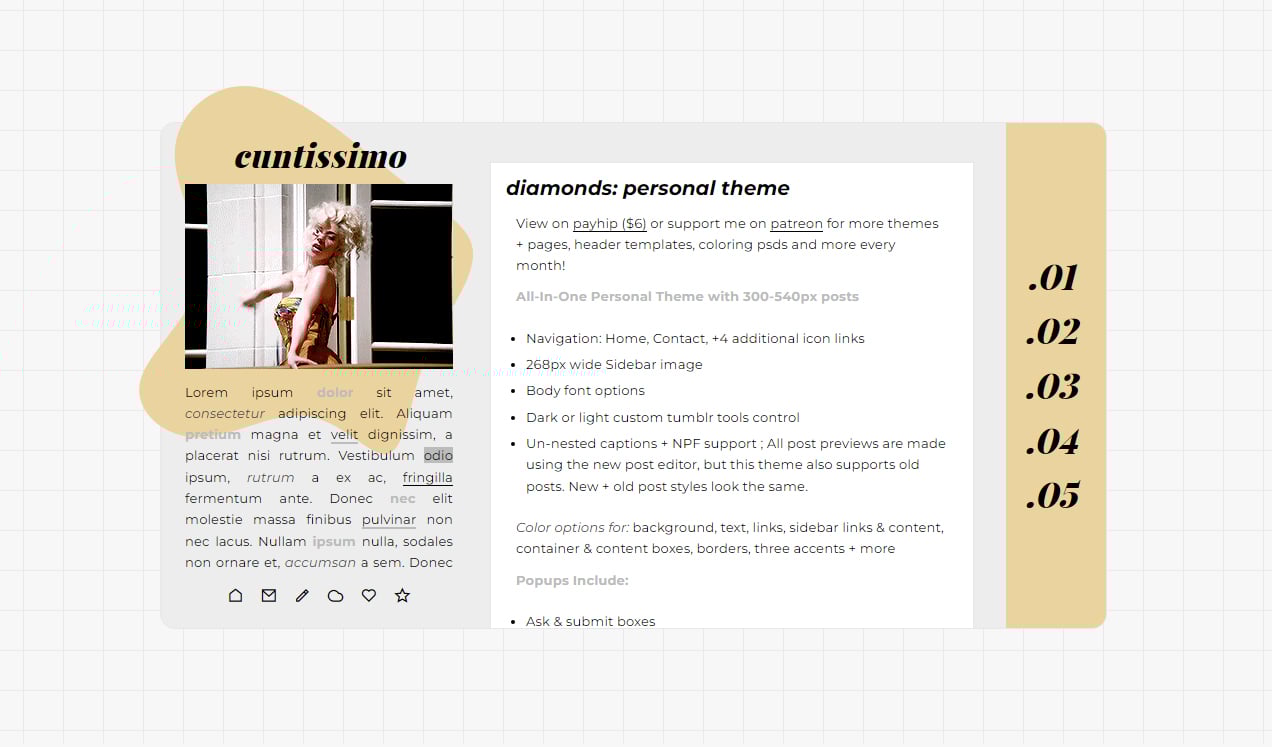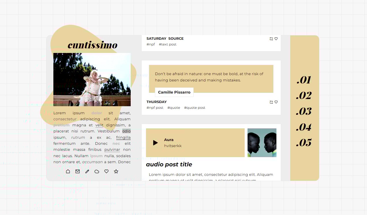 - Un-nested captions + NPF support ; All post previews are made using the new post editor, but this theme also supports old posts. New + old post styles look the same.