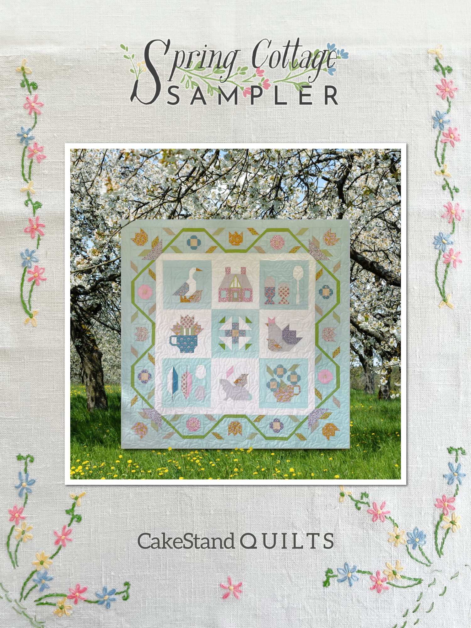 Eight original blocks created for the Midsummer Sampler a quilt that captures the gentle charm of a summer afternoon’s stroll through an English country village…