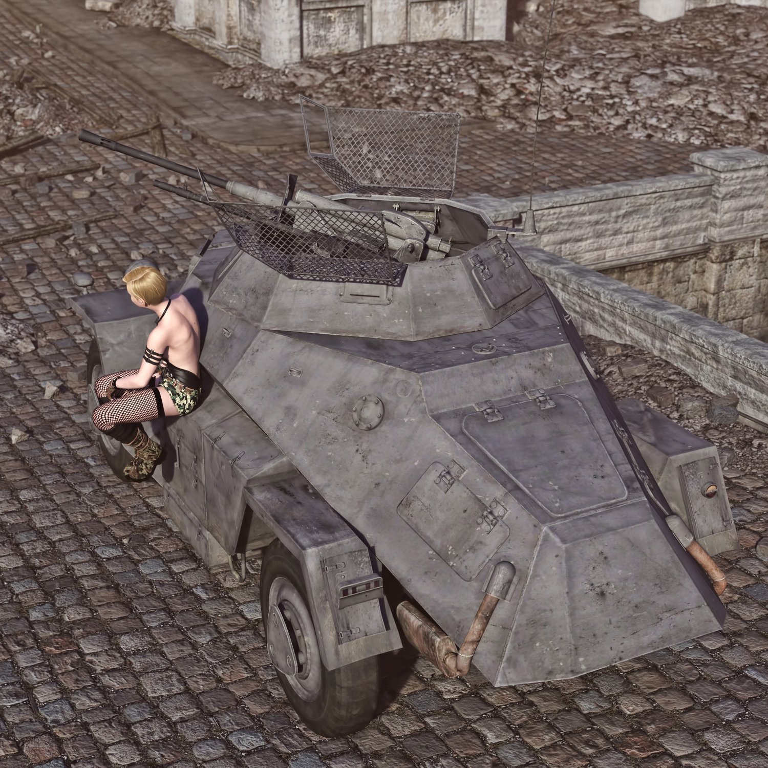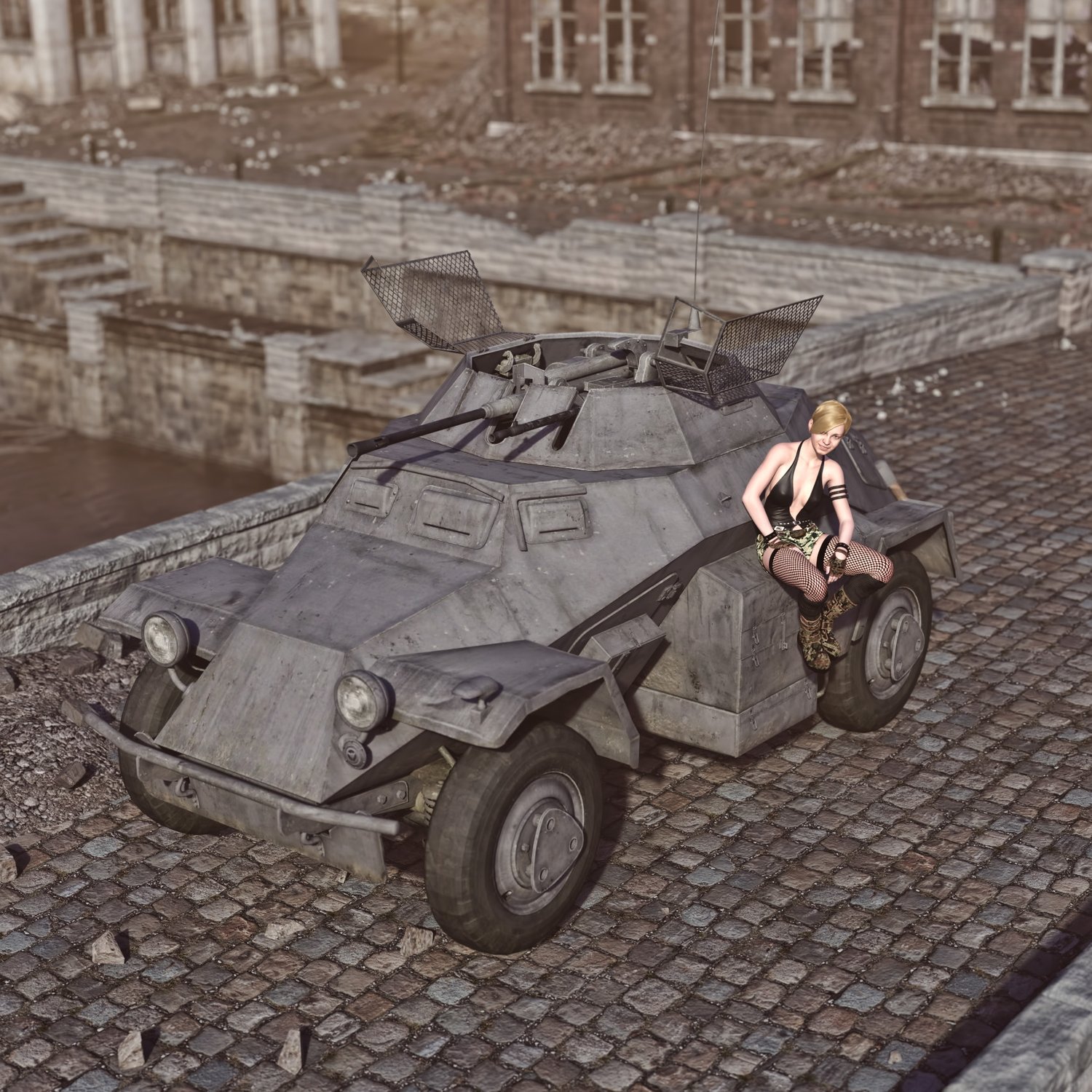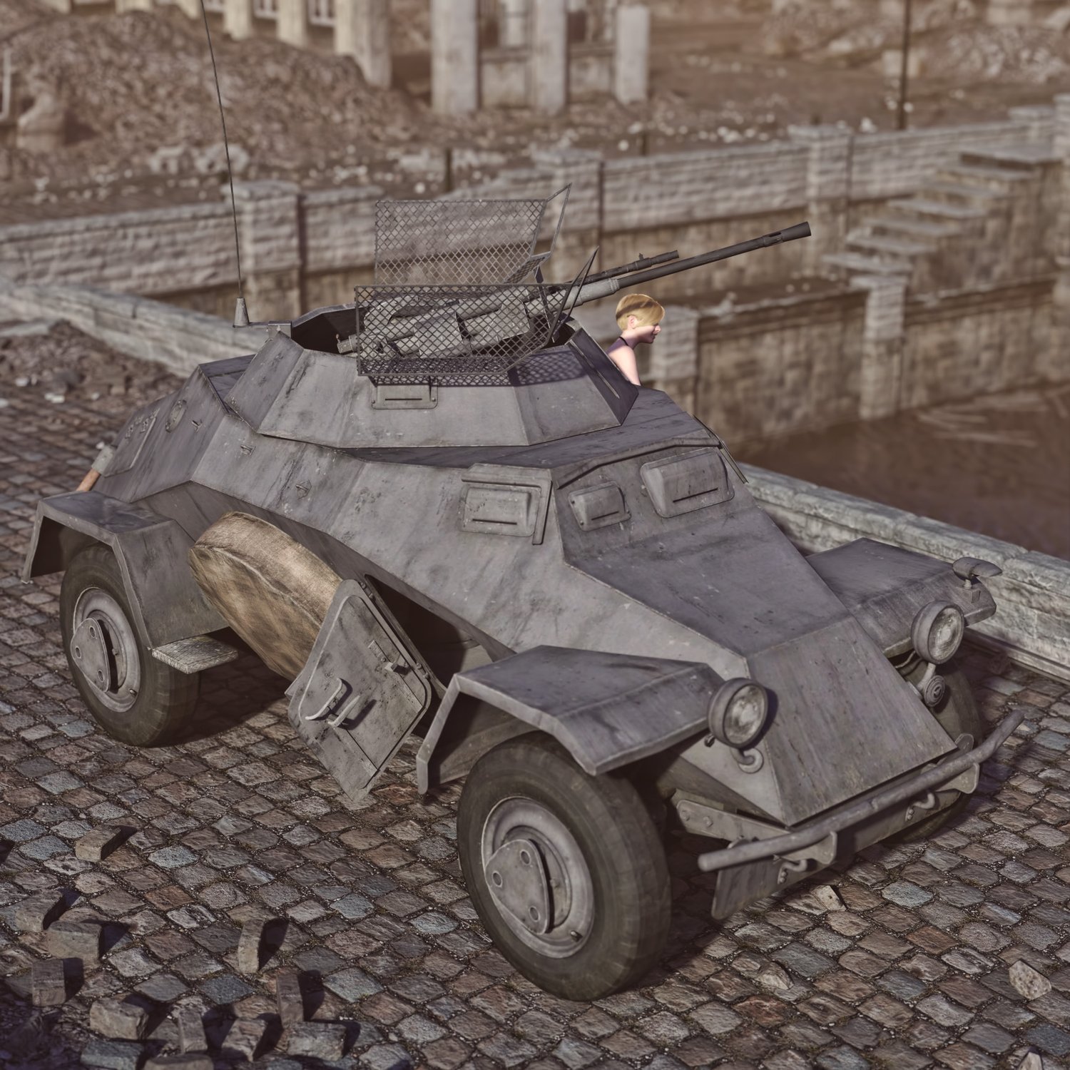 A reconnaissance armored vehicle for an efficient transportation of troops and providing intel and fire support. Essentially an armored car, fast and nimble. Has a good gun but I wouldn't count on it as a sole cover. Turret and gun rigged for realistic pics. The net cover can also be closed or open. Hatches also can be open for dismount and easy access. Good for transportation and for combat with lightly to moderate armored enemies of WW2. The prop is converted and rigged for DAZ.