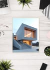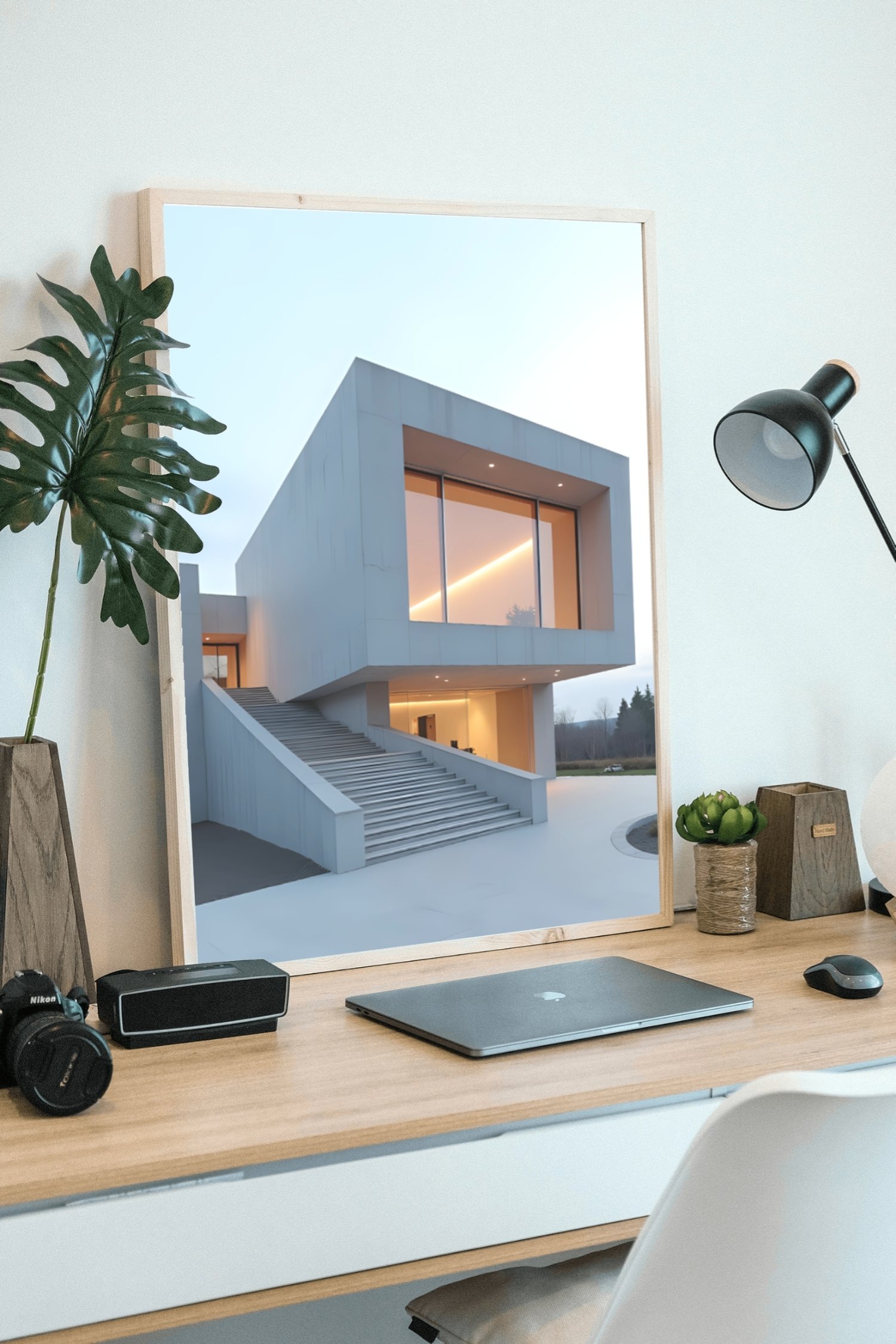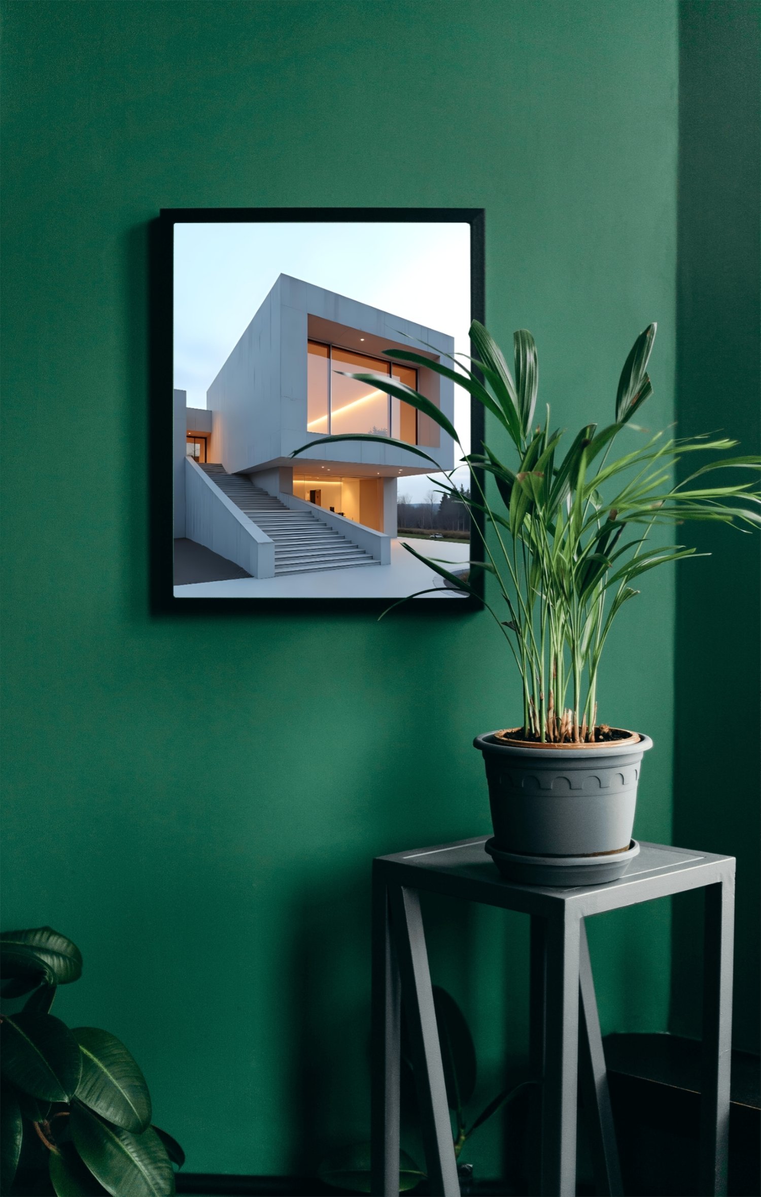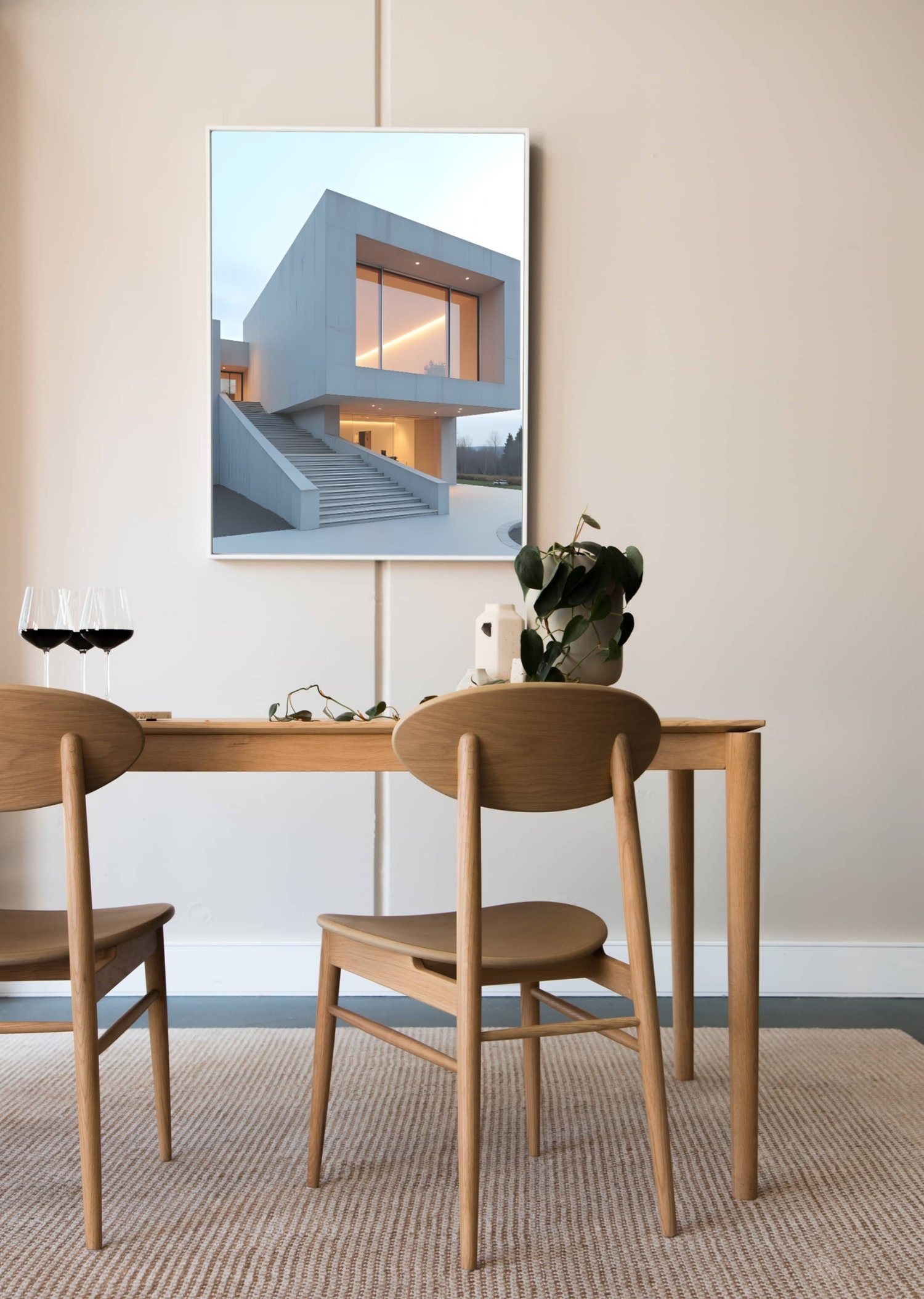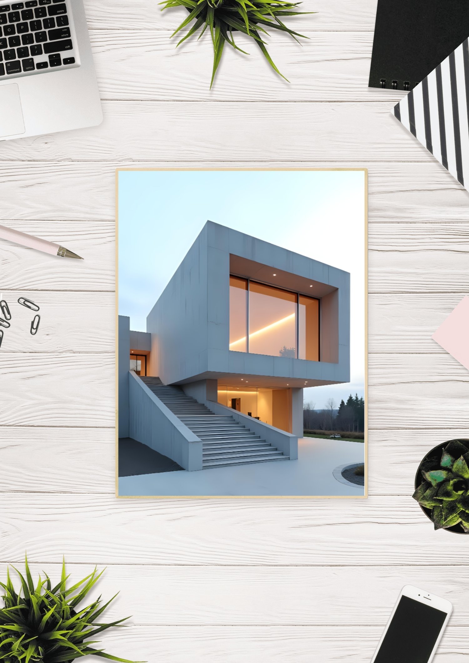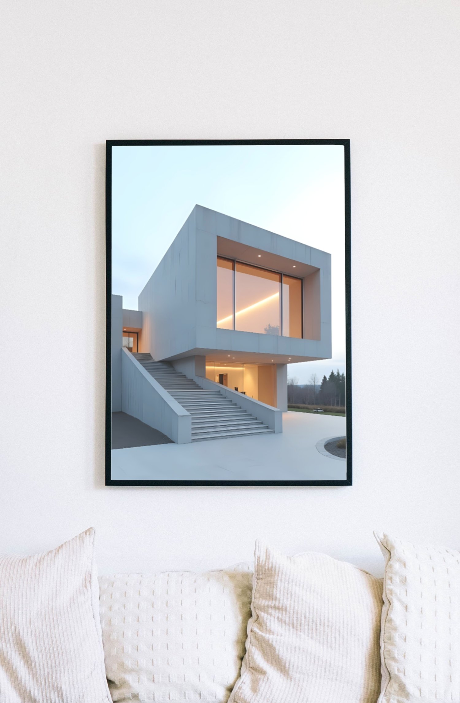 This striking image captures a modern minimalist concrete house, defined by its clean lines, geometric forms, and expansive glazing. A grand staircase leads up to the main living area, which is highlighted by a large picture window offering panoramic views. The use of concrete creates a sense of solidity and permanence, while the minimalist aesthetic emphasizes simplicity and functionality. This image was created using AI as a visualization tool.