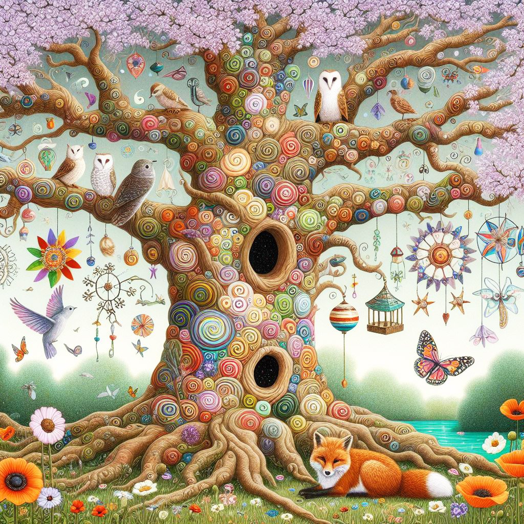 A big old oak tree, with elaborate colourful patterns throughout. It has deep roots & curly branches with white & pink leaves. It has beautiful glass bird houses & spinners hanging from its branches. There are colourful humming birds & robins & owls. On the ground there are poppies & sunflowers & the tree is surrounded by a lake. There is a fox lying amongst the flowers.