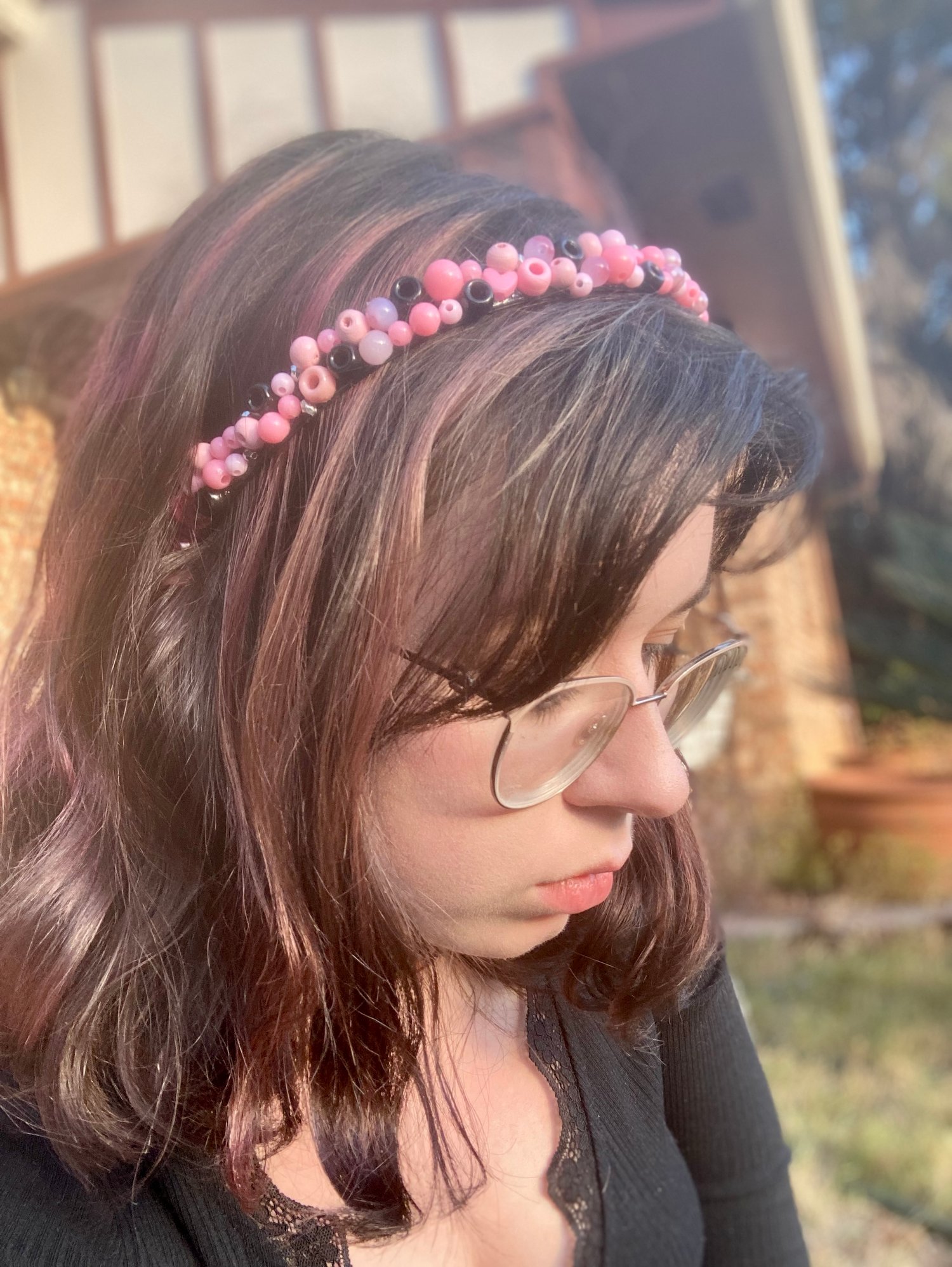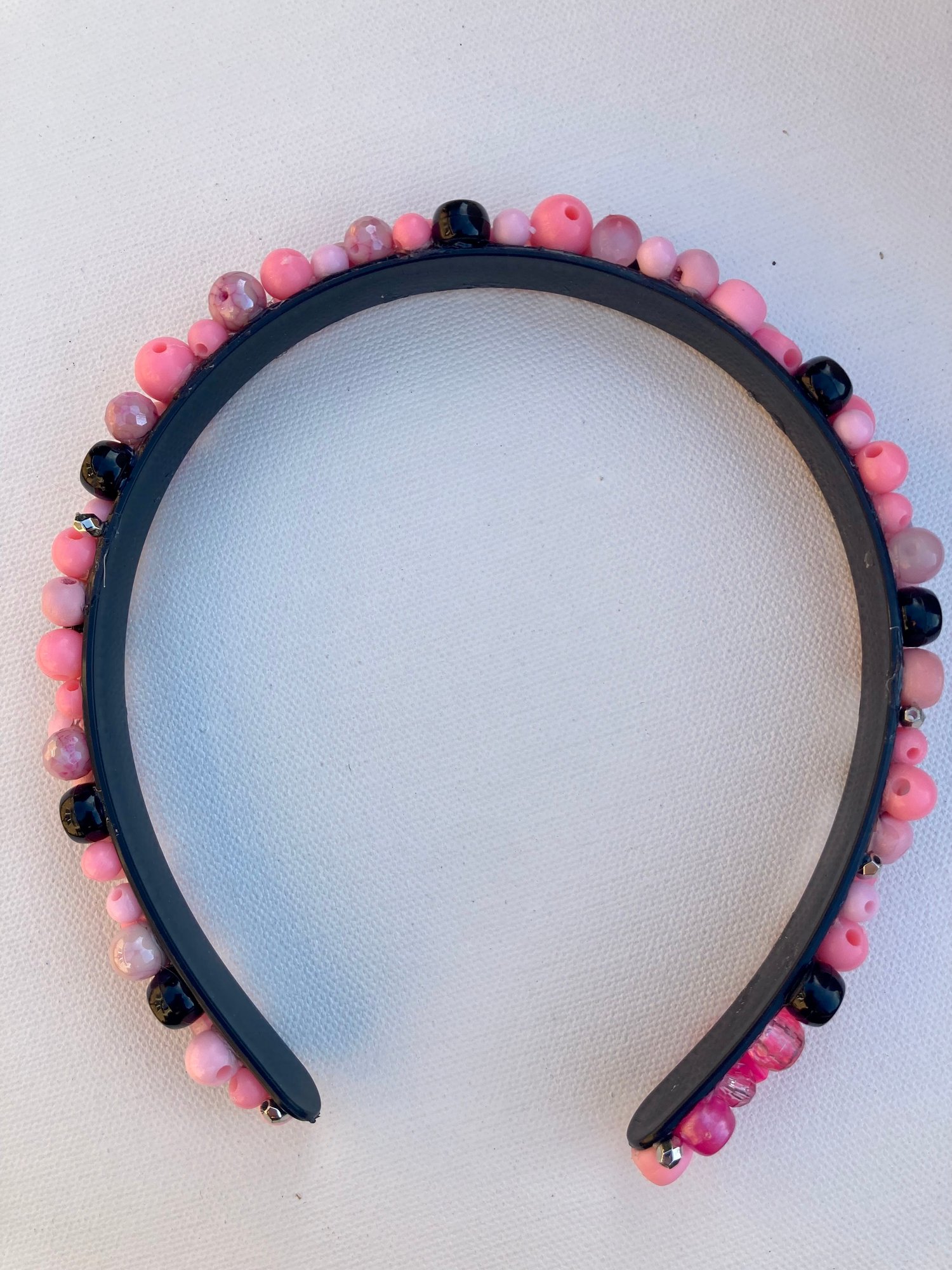 This headband includes pink, black, and silver beads, perfect for any cutesy or emo look.