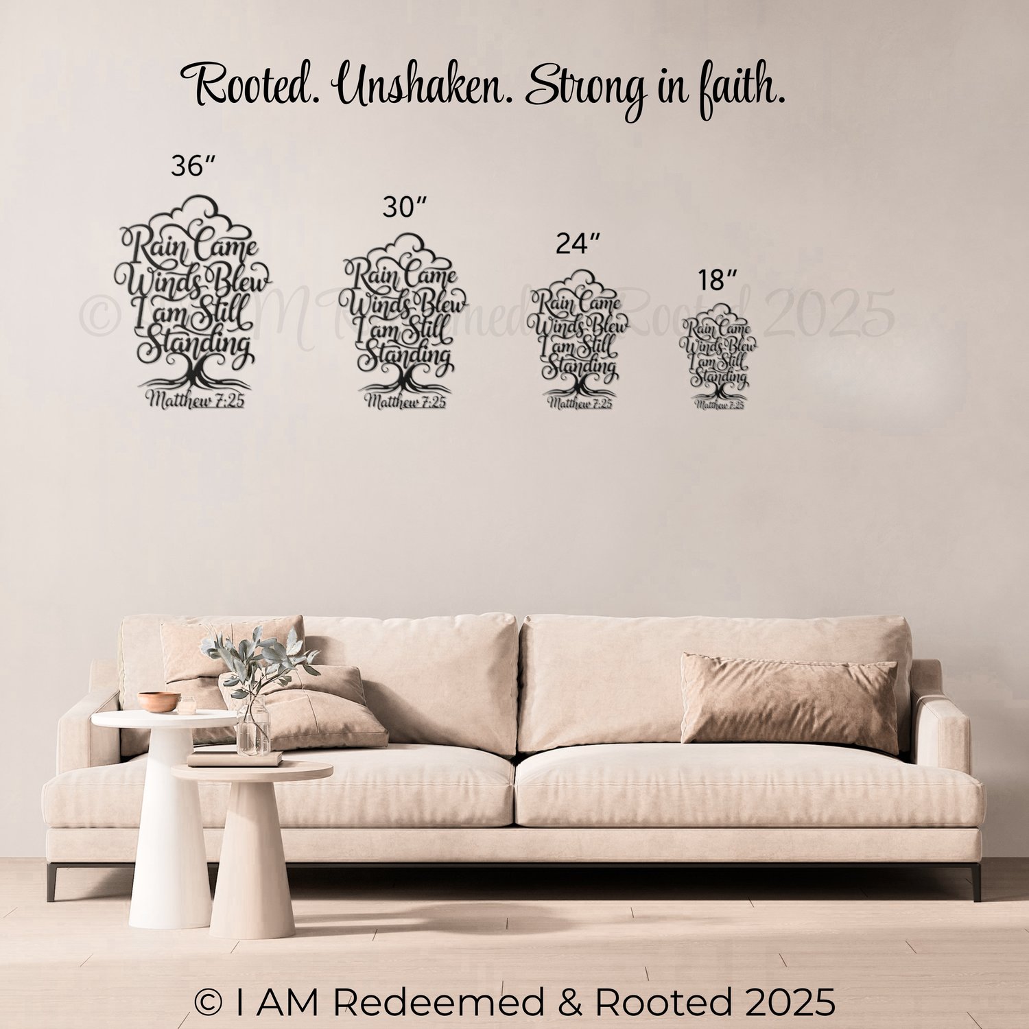 Inspired by Matthew 7:25, this powerful metal wall emblem is a declaration for every believer who has walked through storms and seen God sustain them. The design features a deeply rooted tree symbolizing the unshakable life built on the solid foundation of Christ.