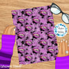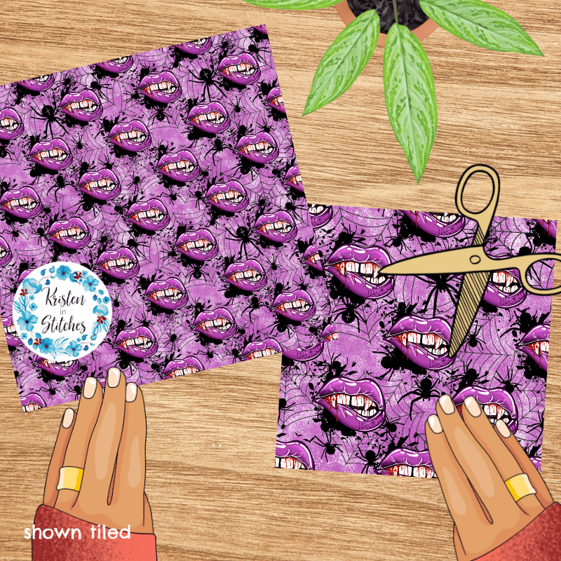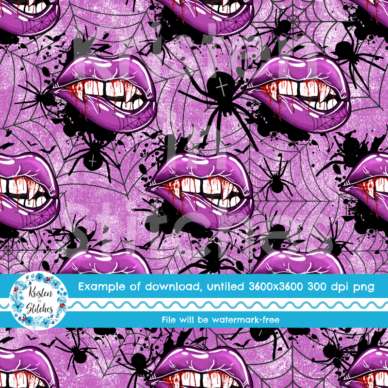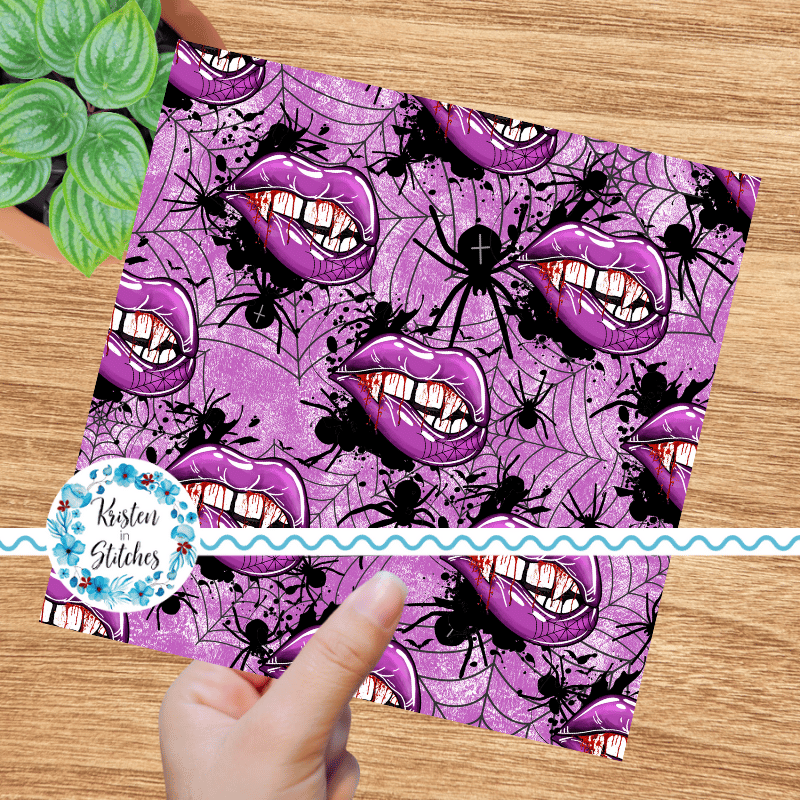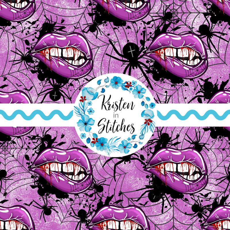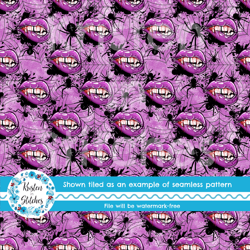Creepy spiders and cobwebs, luscious lips with creepy fang teeth on purple.