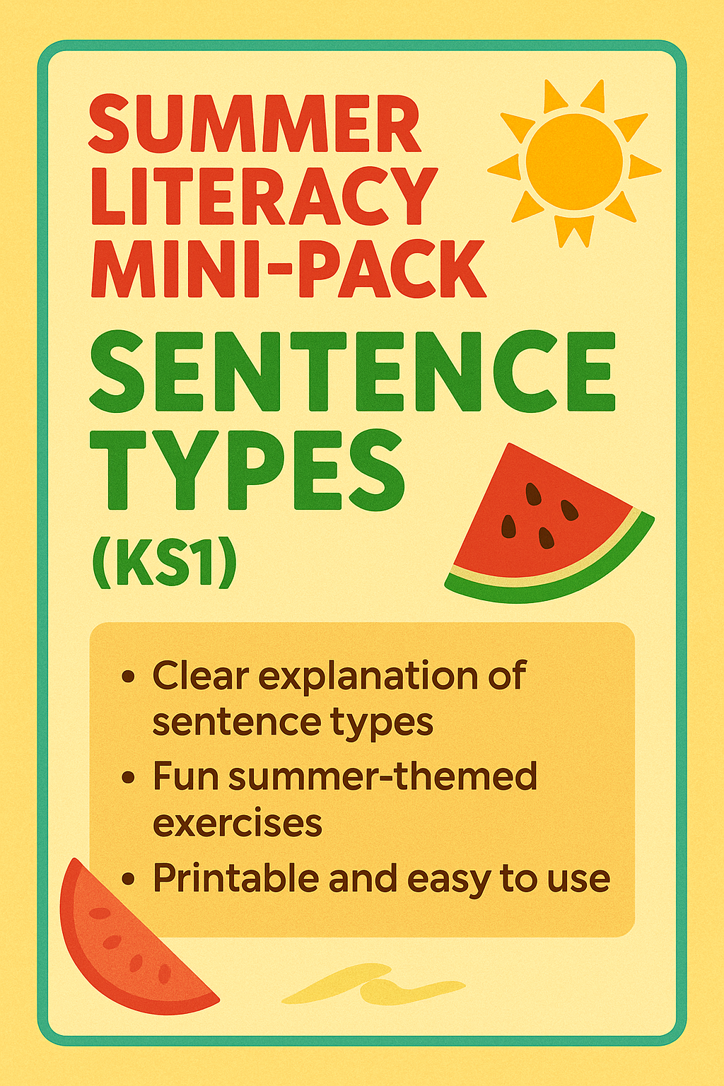 This colourful and engaging Summer Literacy Mini Pack focuses on identifying and using the four main types of sentence: statements, questions, commands, and exclamations. Perfect for KS1 learners, this printable pack includes summer-themed activities that reinforce key grammar skills through fun, accessible tasks.
