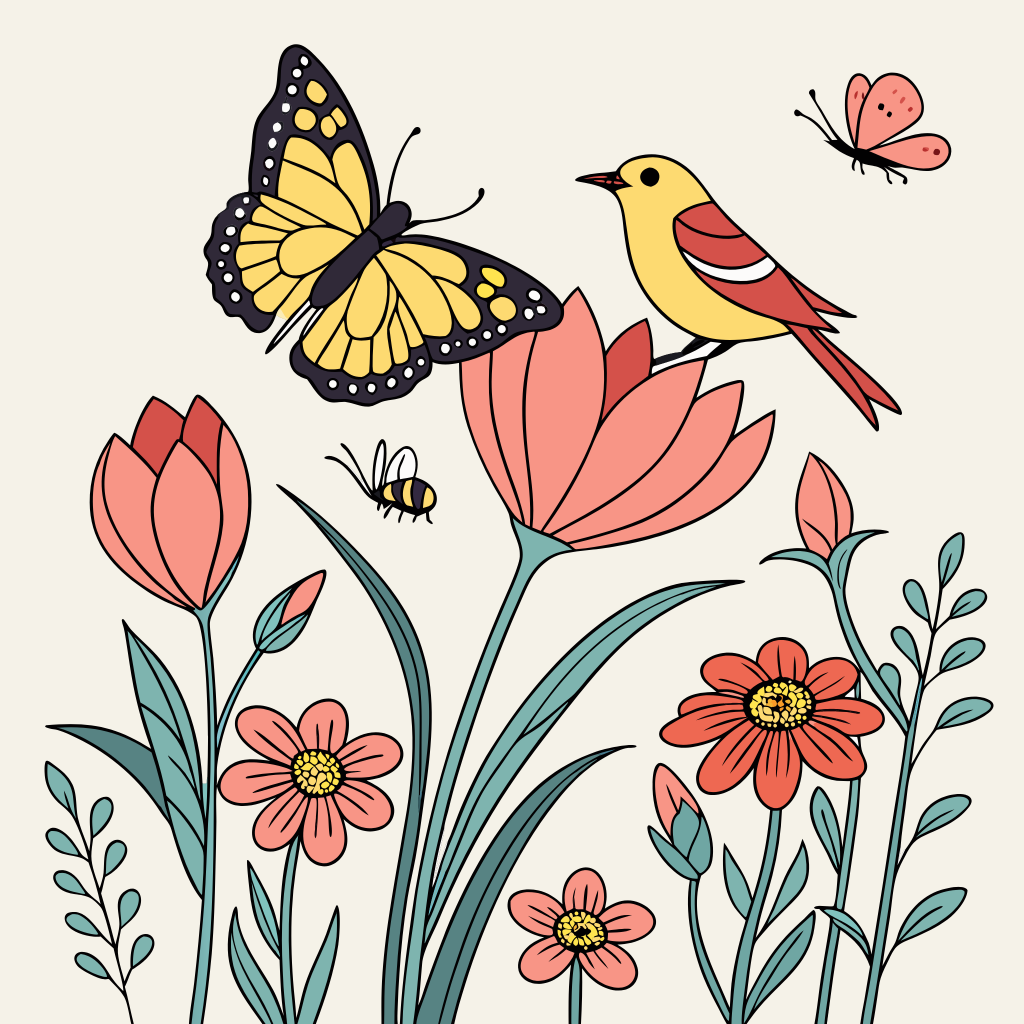 Bring the joy of spring to life with this charming design featuring blooming wildflowers, a butterfly, a buzzing bee, and a cheerful bird. Perfect for nature lovers, gardeners, and anyone who appreciates colorful wildlife in a peaceful garden setting. This whimsical illustration captures the magic of the natural world in full bloom.