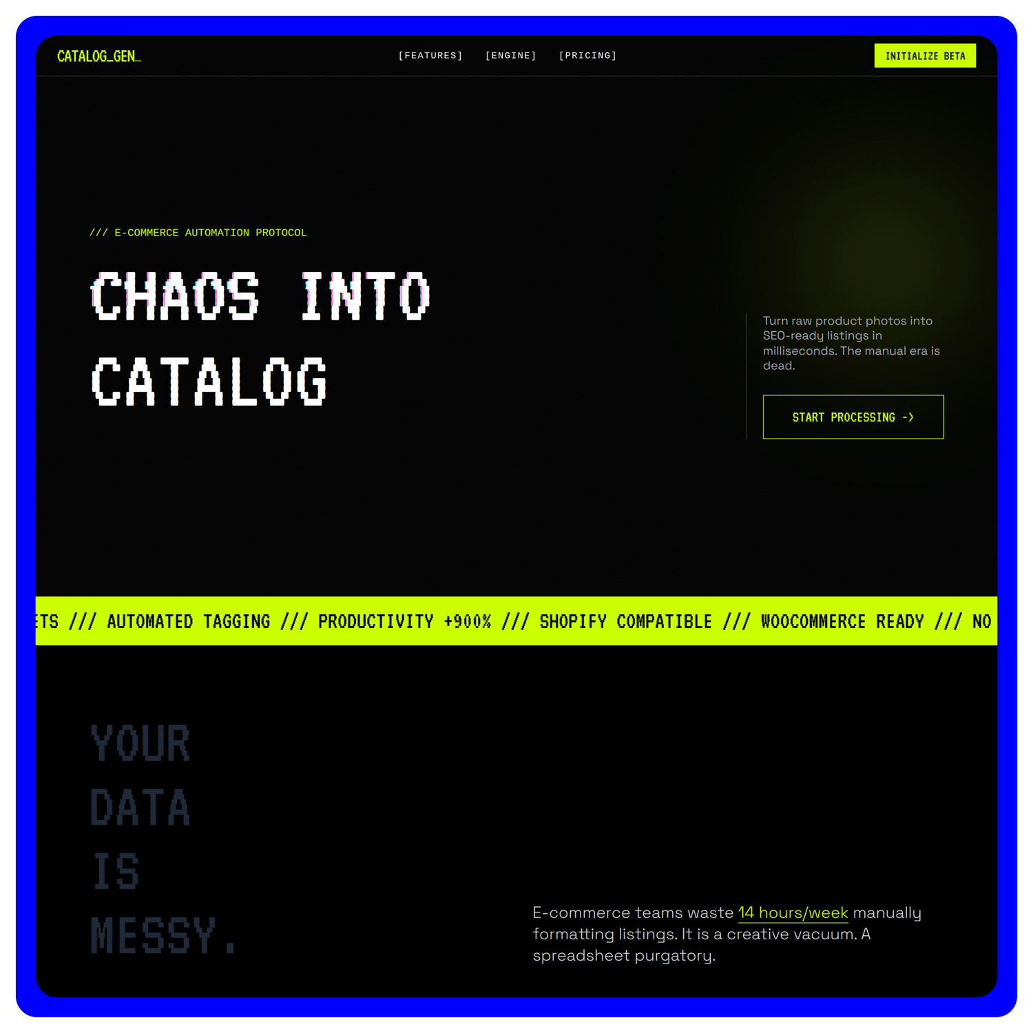 CatalogGen AI is a bold, brutalist landing page template designed for e-commerce automation, product-listing AI, catalog generators, and Shopify/WooCommerce tools. With pixel fonts, glitch accents, scanning animations, and module-focused storytelling, this template helps you position your tool as an industrial-grade automation engine.