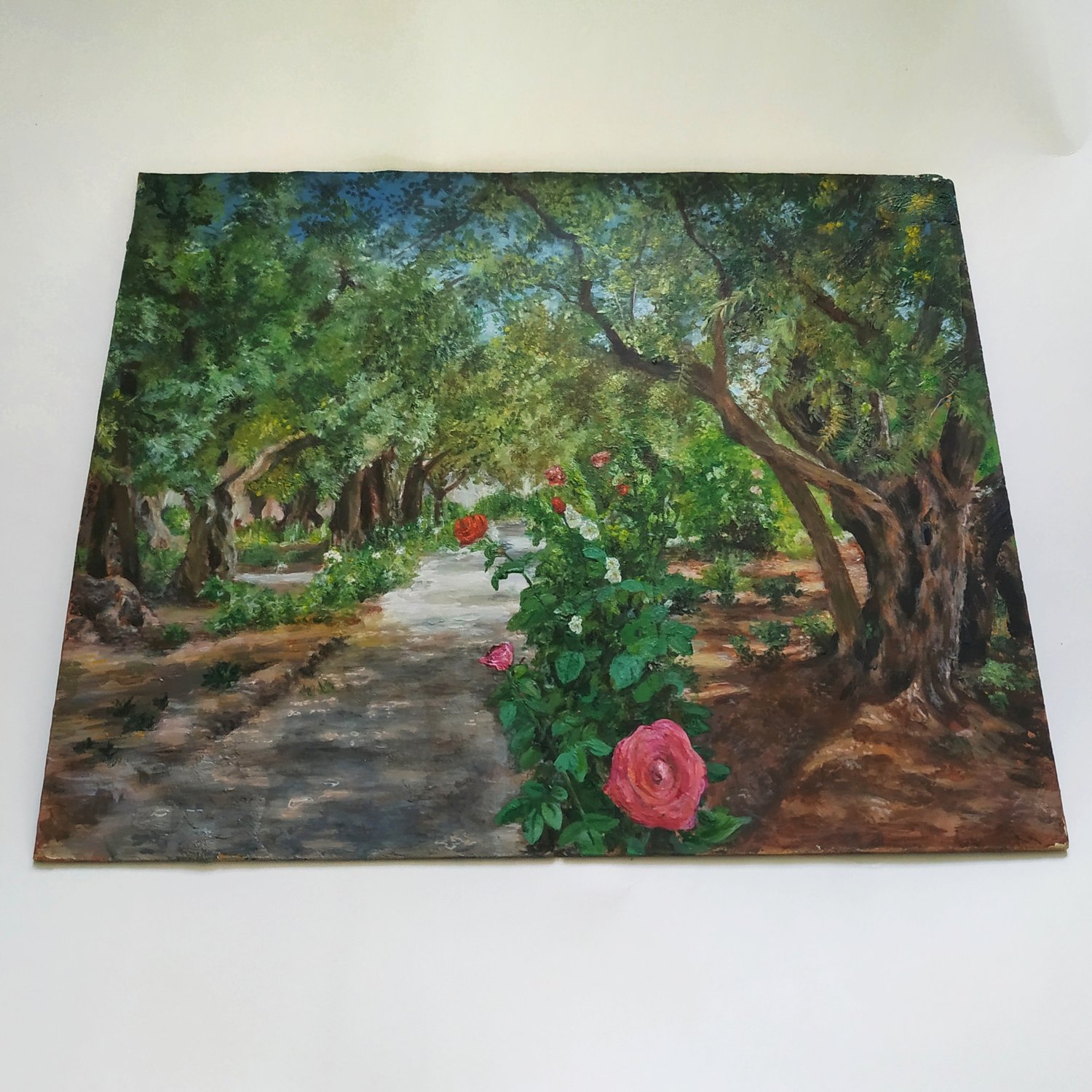 Decorate your home with this original impressive painting of Gethsemane garden view, let it always take you you into one of the sacred biblical places.