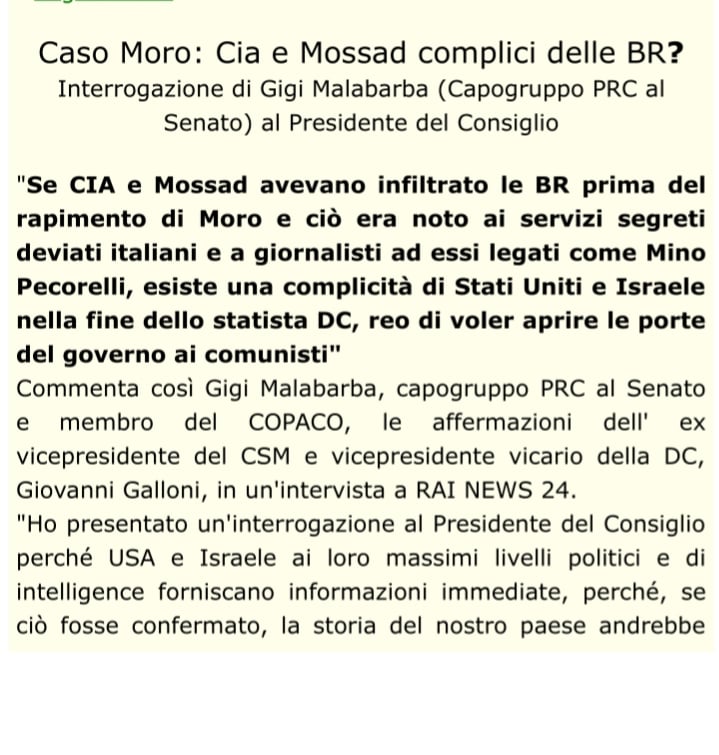 L'Offensiva Parlamentare Il giorno successivo, il senatore Malabarba trasforma queste "voci di dentro" in un'interrogazione al Presidente del Consiglio. Malabarba chiede conto di una complicità internazionale nella fine di uno statista reo di voler dialogare con il PCI. Se confermati, questi fatti imporrebbero di riscrivere interamente la storia d'Italia, declassando il caso Moro da episodio di terrorismo a colpo di Stato internazionale coordinato.