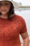 The Salty Air Tee is knit seamlessly from the top down. The neckline is cast on and short rows are worked to raise the back of the neck for a comfortable fit. The yoke lace is knit, then the body and sleeves are separated and worked from the top down.