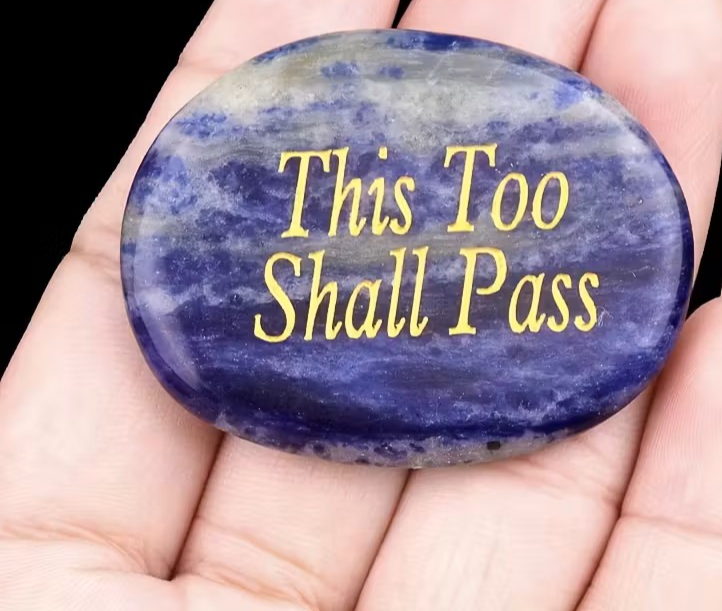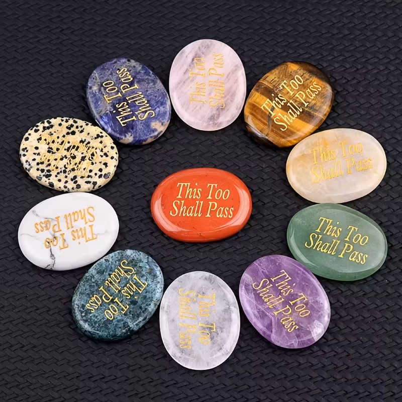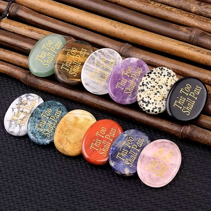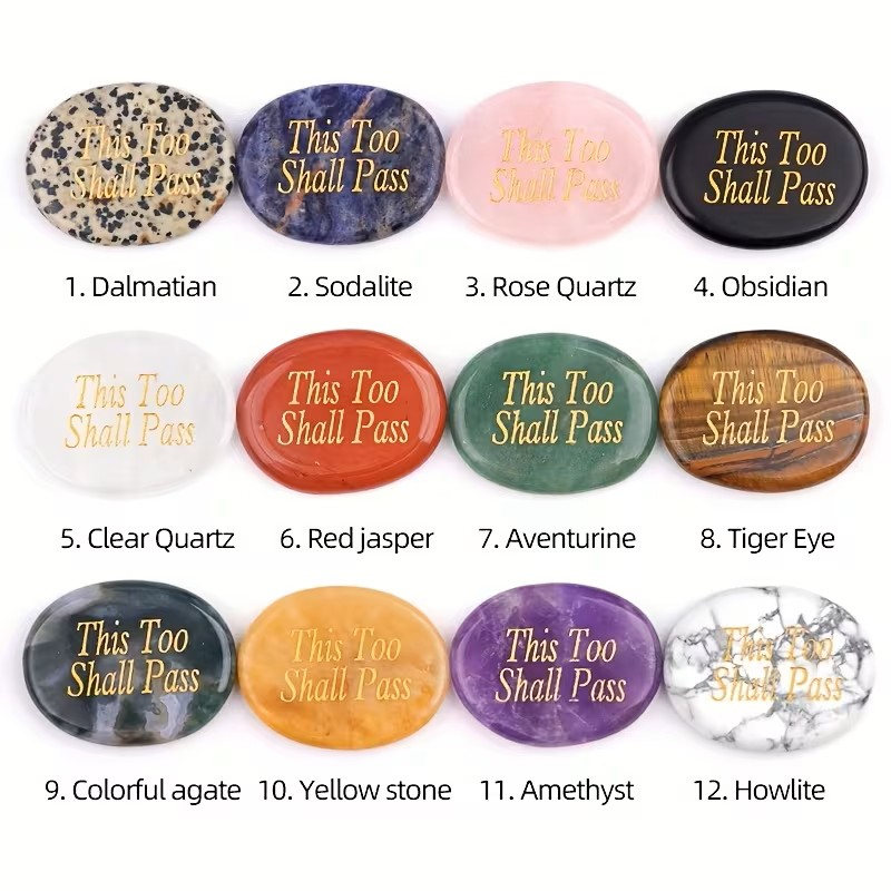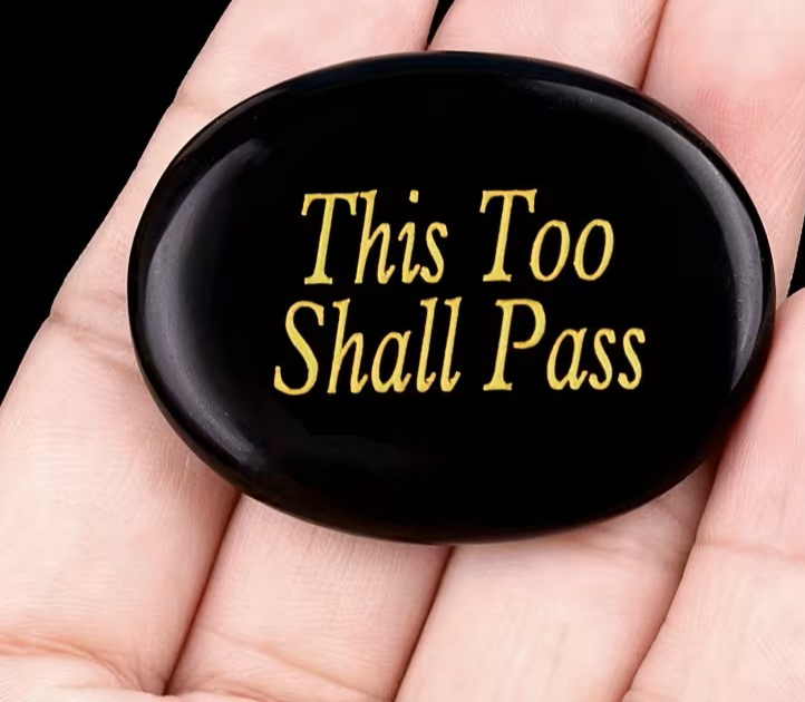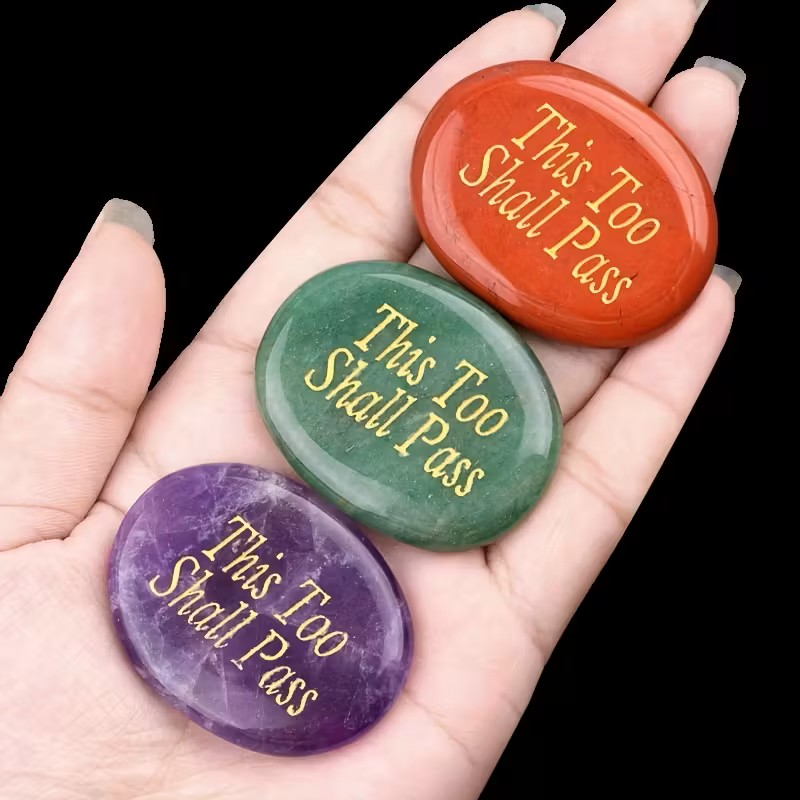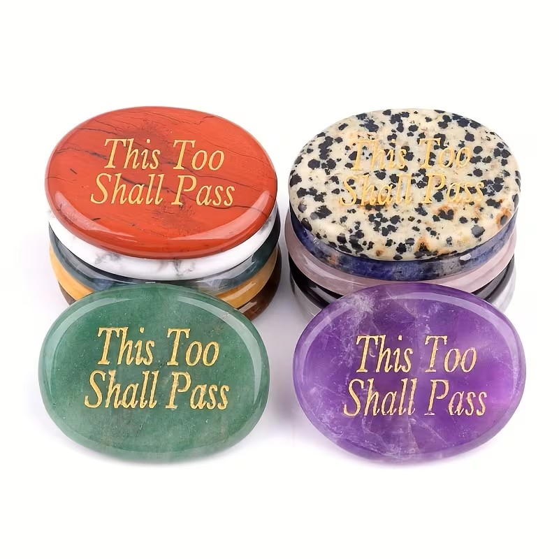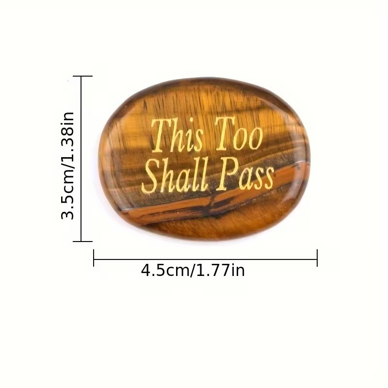 Naturlig gravert stein med teksten "This Too Shall Pass" leveres i smykkeboks, er en fin gave både til deg selv og andre og kommer i følgende varianter: