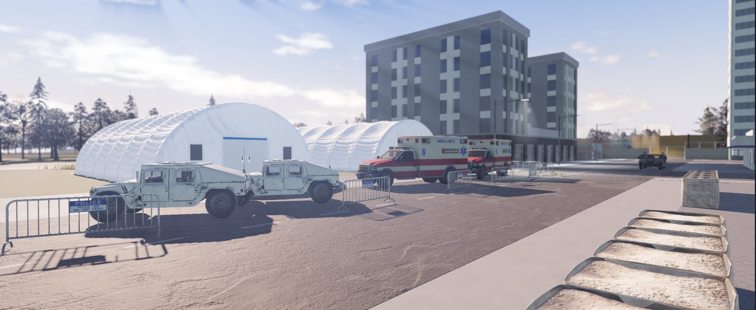 Debris, barricades, signage, and abandoned objects placed throughout to reinforce the quarantine narrative and immersion.