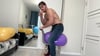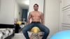 Miguel has returned to the scene! Sporting only jeans, he bursts one balloon with a puff and sits on others of varying sizes.