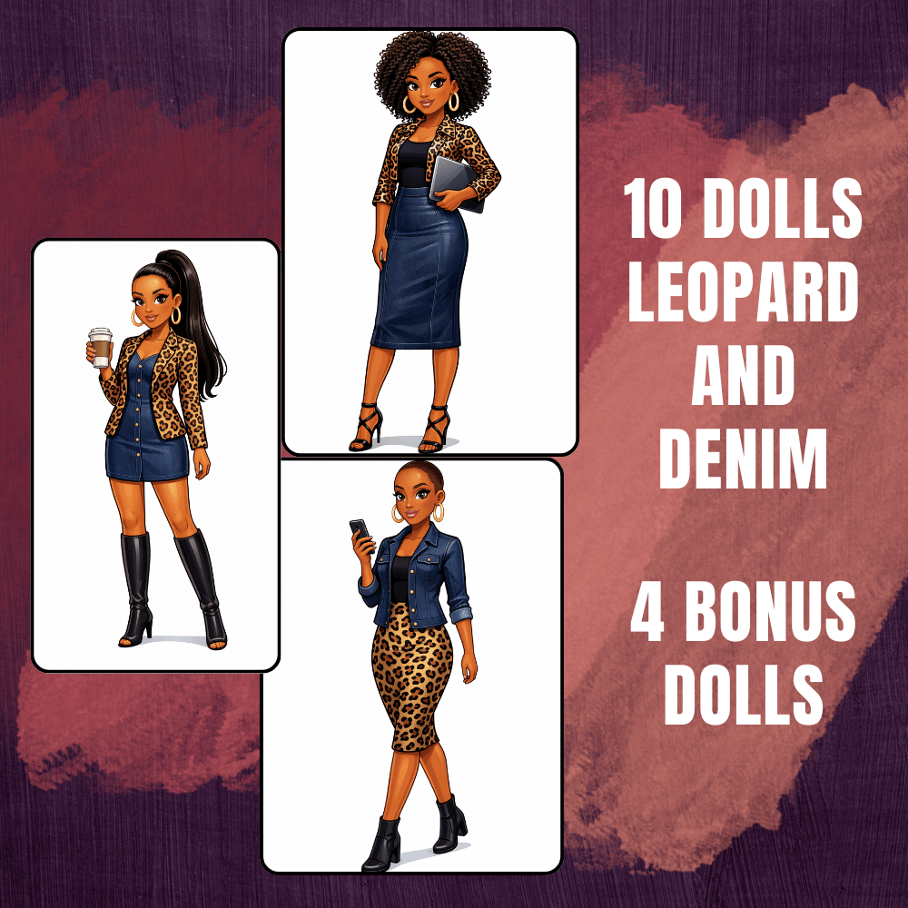 This unique set is ideal for creating personalized projects like stickers, greeting cards, invitations, scrapbooking, print-on-demand, social media posts, and so much more. The high-quality Leopard and Denim Clipart PNG files effortlessly showcase the style of stunning women everywhere. Made with Ai.