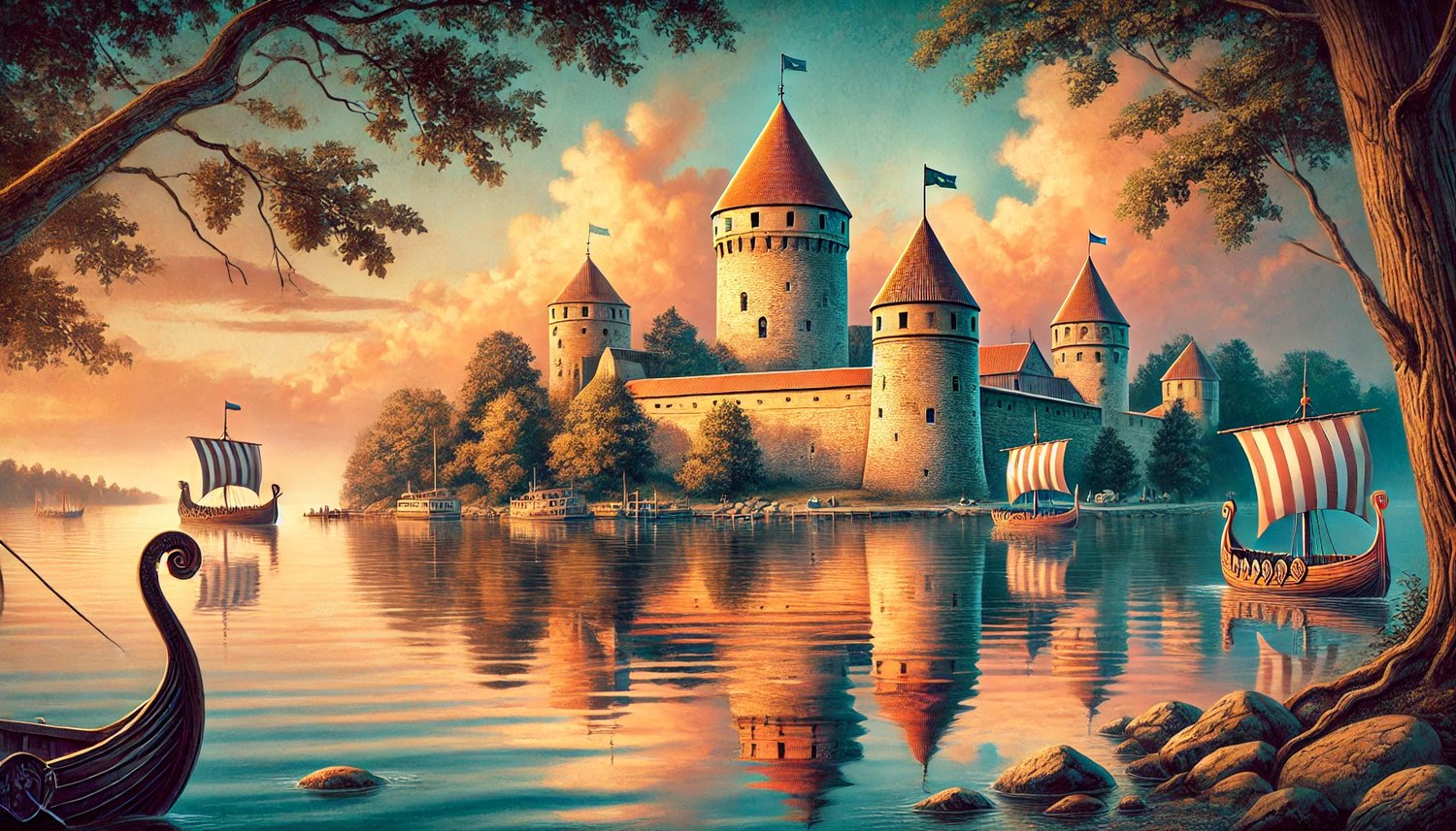 The waters reflect the castle’s grandeur, mirroring the sky’s warm tones and the gentle movement of Viking-style ships sailing towards the fortress. The composition is framed by overhanging tree branches and rocky shores, enhancing the natural harmony between the architectural masterpiece and its landscape.