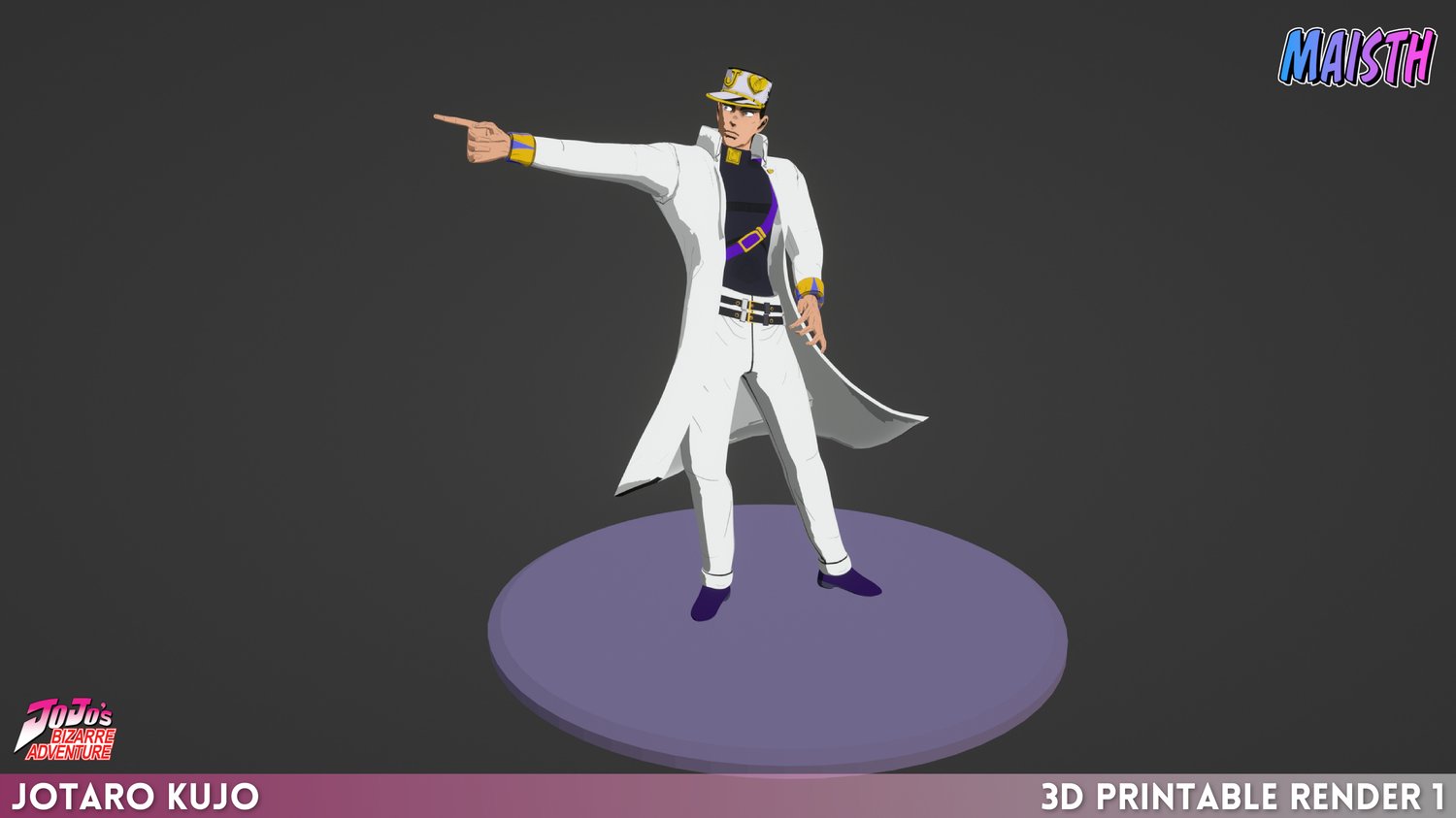 This is a 3D Model of Jotaro Kujo, from JoJo, created from the ground up, this model is based on the anime series, specifically Part 4, but taking some big liberties like having a more mixed design between the first and second iteration of part 4, but still trying to have the same type of feeling as the series.