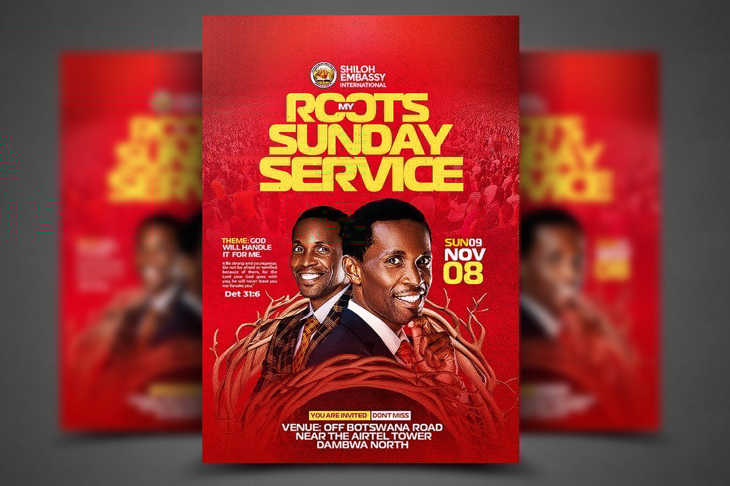 Looking for a Church poster design template in PSD format to make your editing process faster and more professional? This my roots Sunday service template is designed to help your church announcement stand out with ease. Whether it’s a Bible study, youth gathering, or prayer meeting, this template delivers