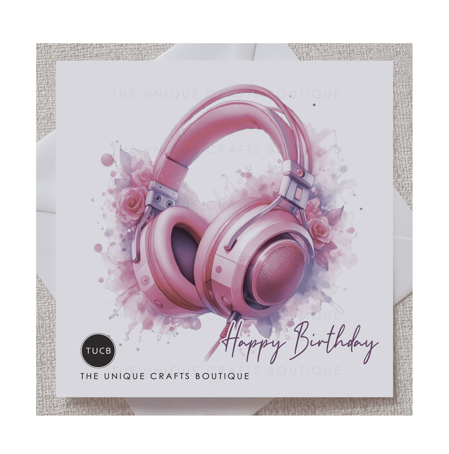 Printed with a Pink headset and with the message 'Happy birthday'. This card is perfect for both gaming lovers and music lovers alike.