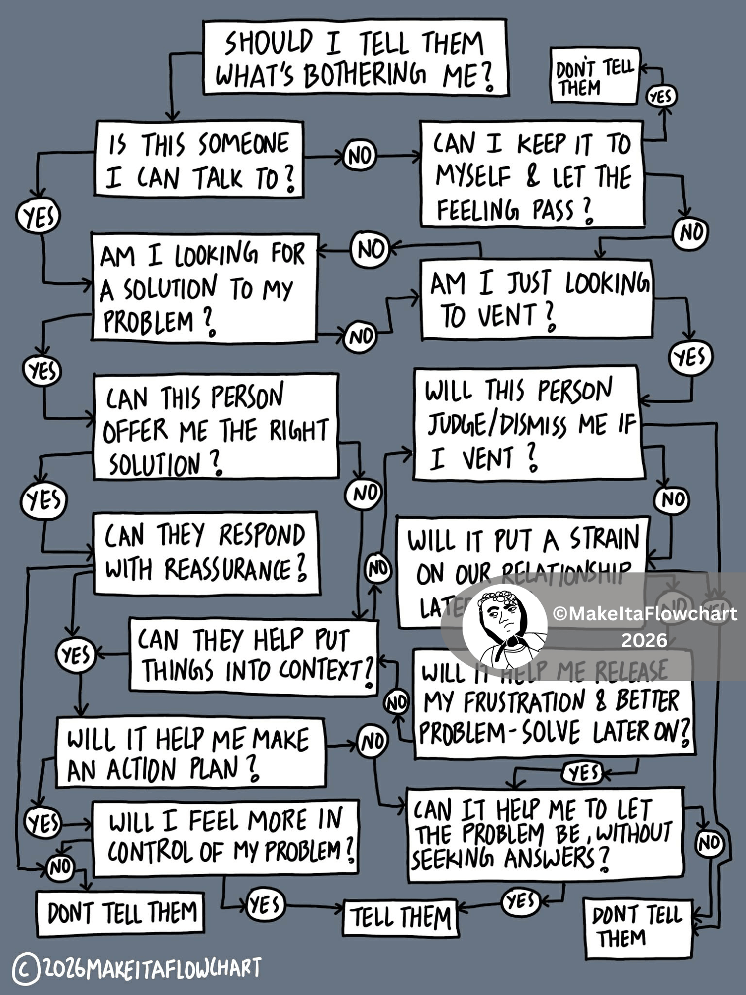 Printable version of the flowchart "Should I tell them what's bothering me?" to help you in decision making and save time from constant overthinking.