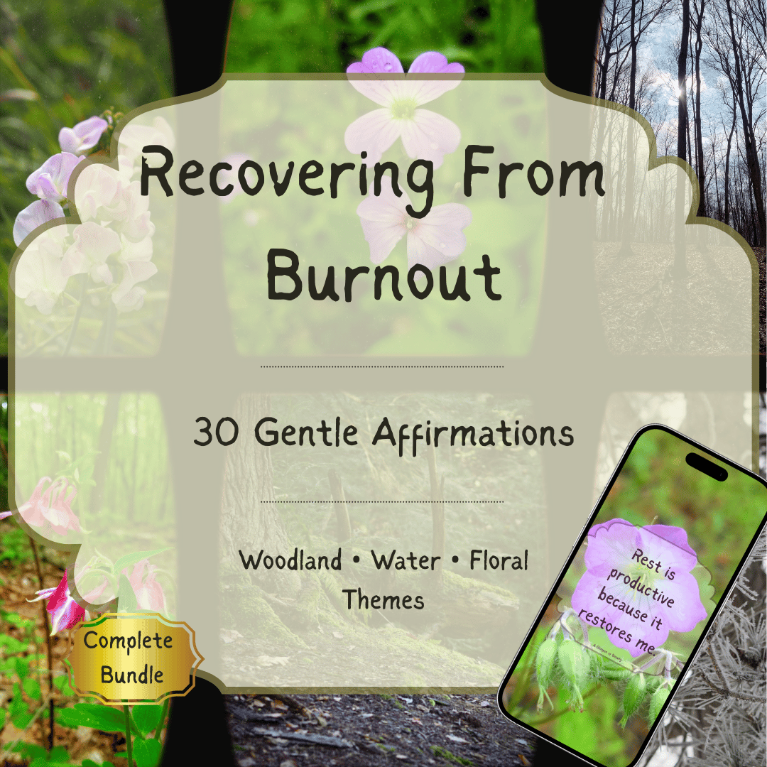 This bundle includes three nature-inspired affirmation wallpaper collections created to support your journey of recovering from burnout. Each collection pairs meaningful affirmations with peaceful nature photography, offering calming reminders you can carry with you throughout your day. With three visual themes — woodland, water, and flowers — you can choose the atmosphere that resonates with you most in the moment. Each theme offers a different emotional tone while supporting the same intention: encouraging compassion, reflection, and personal growth.