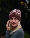 Sample pictured is size 3 modeled on a 21.75” / 54.5 cm head circ, demonstrating a negative ease of 2.75” / 7 cm. Yarn is Serendipitous Wool Co Vajra Fingering in the colorways Tannumai (MC) and Milkweed (CC).
