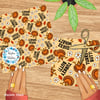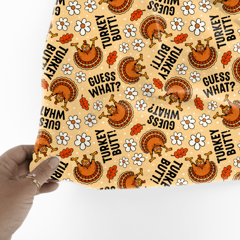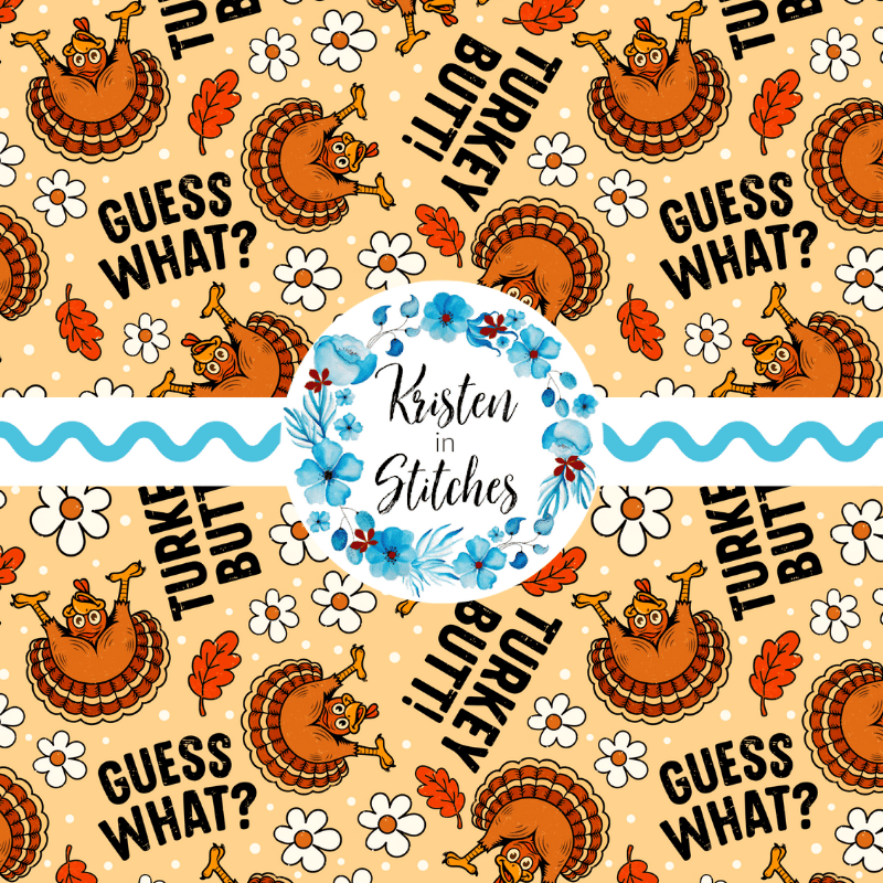 A sarcastic Thanksgiving pattern featuring turkey butts and flowers on buttery yellow.