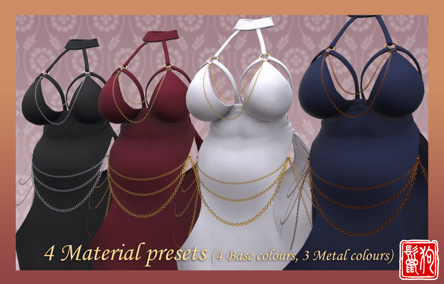 - The Unity Package comes with 4 preset materials for the Dress base and 3 preset materials for metal and chains! There's also a material set up for you to customize the colours in Unity yourself!