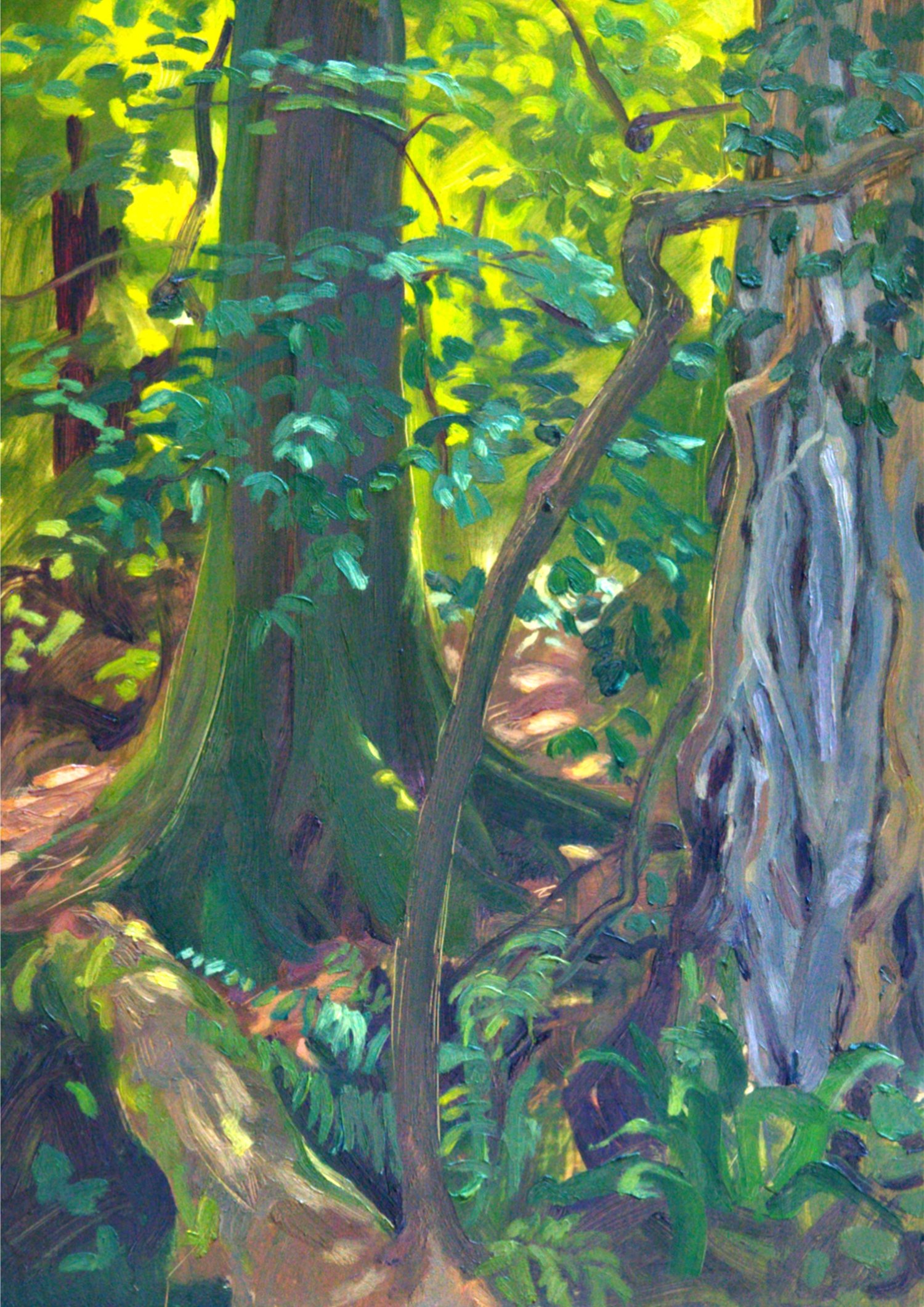 A print taken from an original oil painting made from life in the woodland at Cockington Court. The work reflects James’s ongoing exploration of woodland space, capturing filtered light, shifting greens and the quiet character of the forest interior.