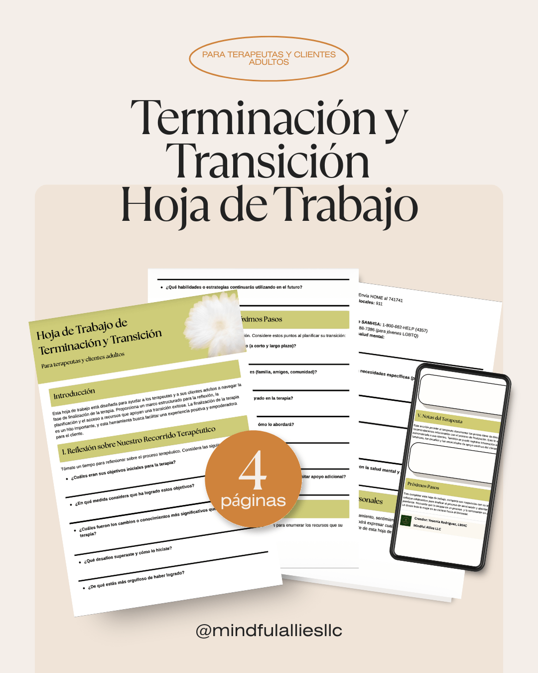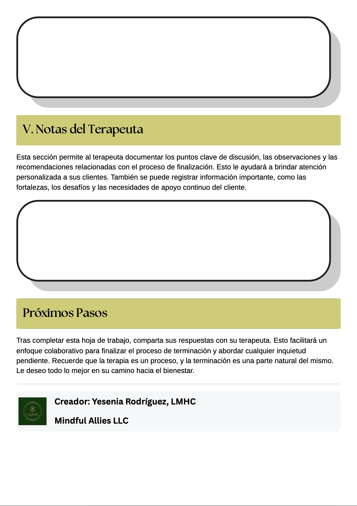 ✨Si eres un profesional de la salud mental que busca una manera respetuosa y estructurada de acompañar a los clientes durante la fase de terminación de la terapia, esta hoja de trabajo fue creada para apoyar una transición consciente y clínicamente sólida.