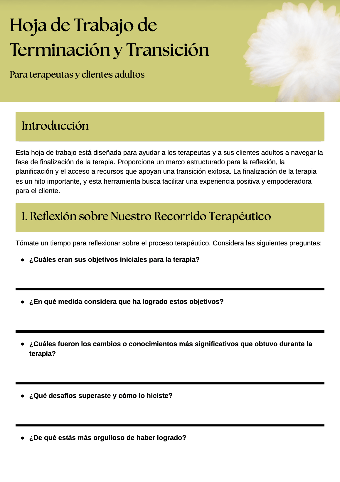 Una hoja de trabajo reflexiva y guiada diseñada para apoyar a terapeutas y clientes adultos durante la fase de terminación de la terapia con claridad, intención y cuidado.