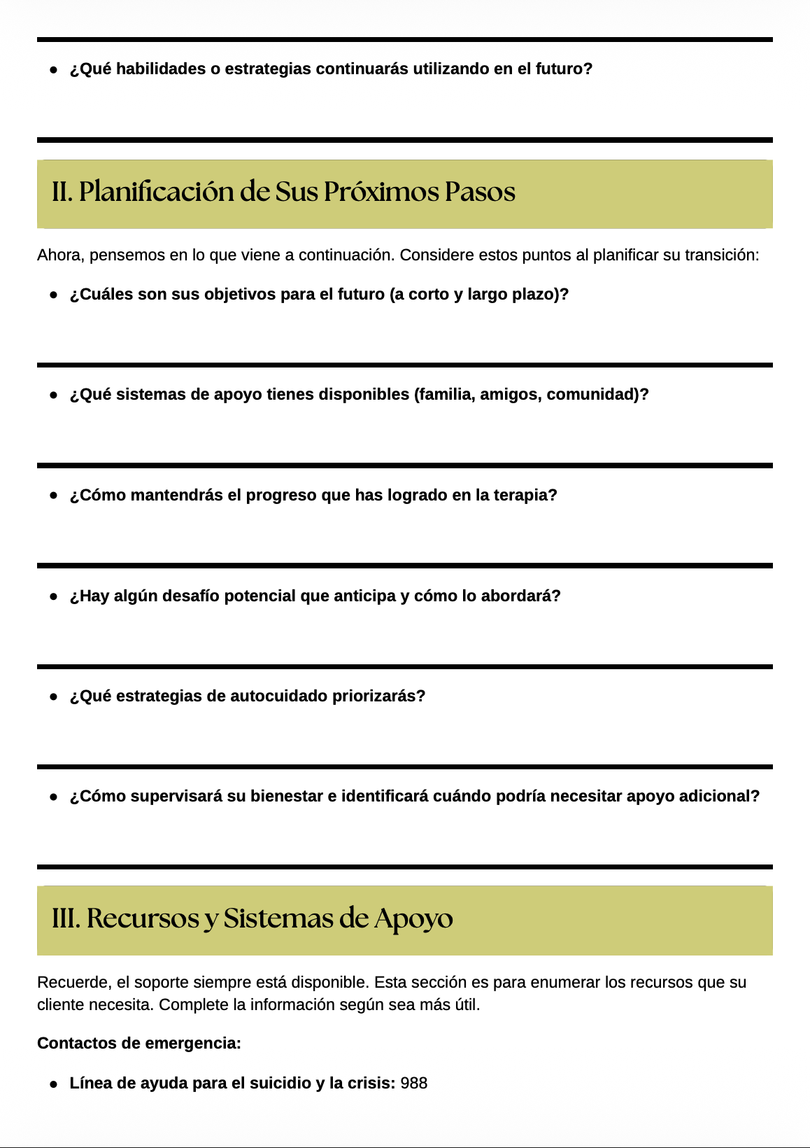 Esta hoja de trabajo digital puede completarse de manera colaborativa en sesión o de forma independiente por el cliente, lo que la convierte en una herramienta flexible para terminaciones intencionales, transiciones planificadas o modelos de terapia de tiempo limitado.