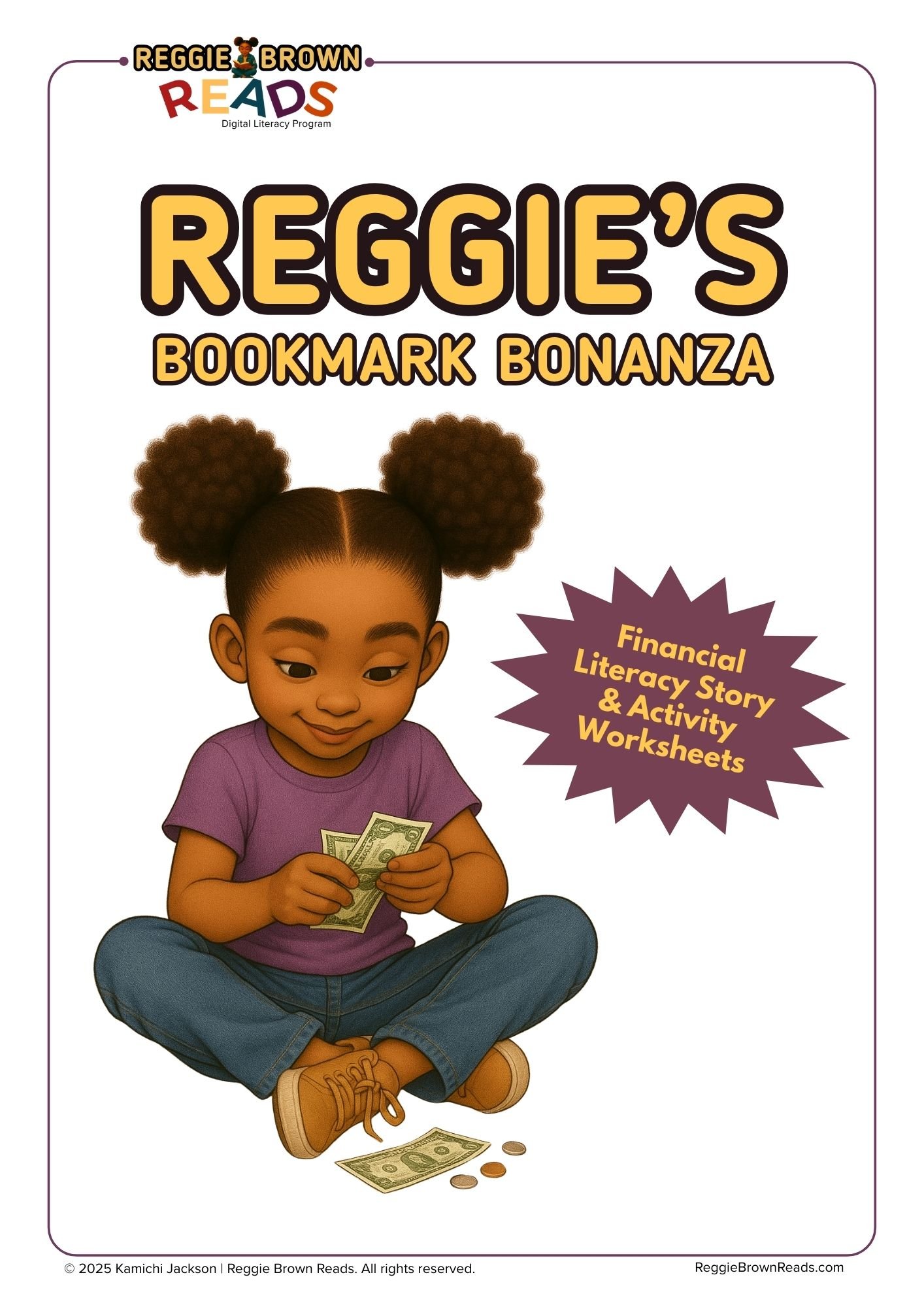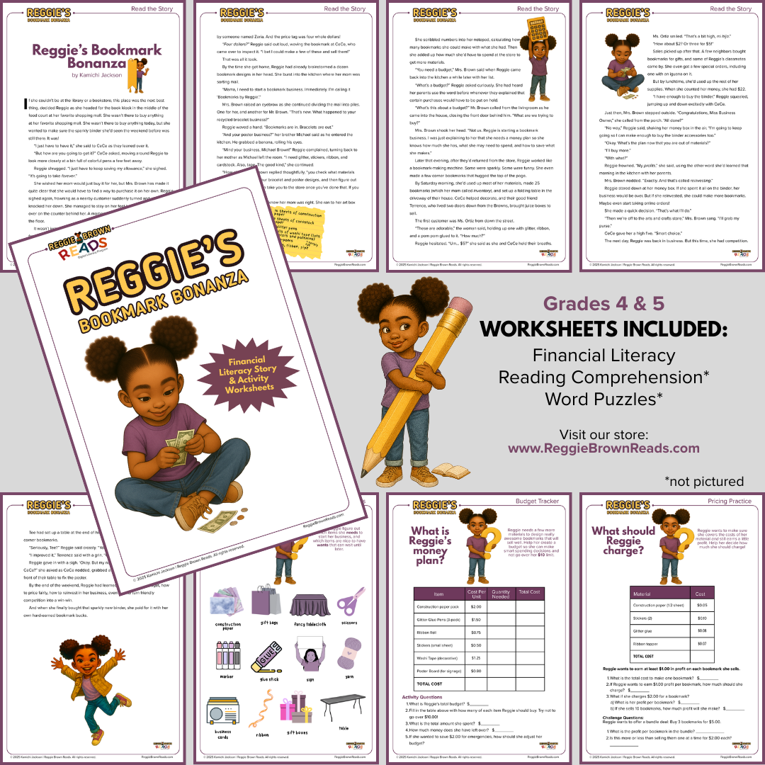 In Reggie’s Bookmark Bonanza, kids follow her fun and relatable journey as she figures out how to save money, make a budget, and run her “business” designing handmade bookmarks. Through this story and the hands-on activities that follow, readers get to explore real-life money smarts like spending wisely, setting prices, and making thoughtful choices. It’s a great way to mix reading, math, and creativity—all while cheering Reggie on!