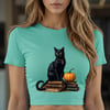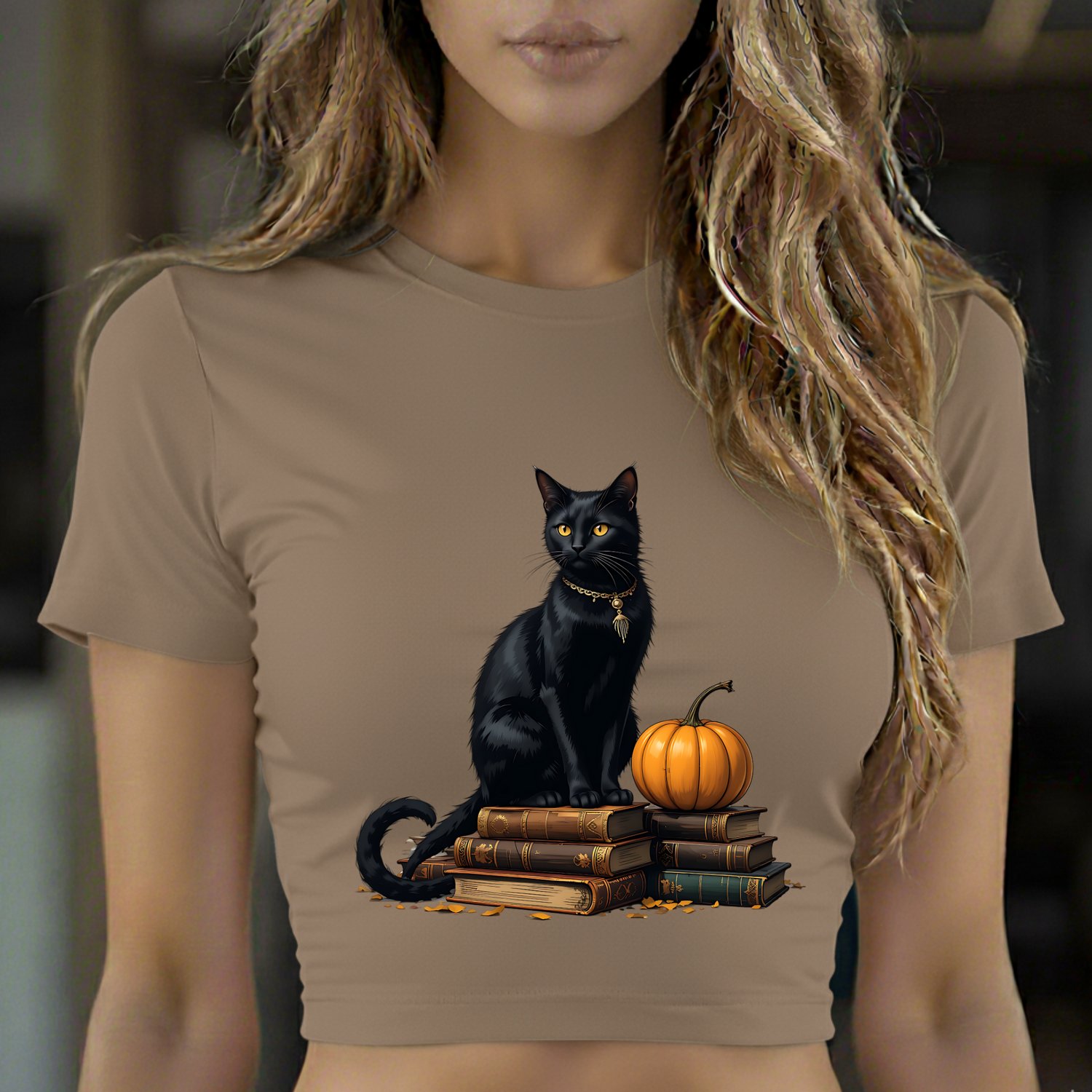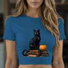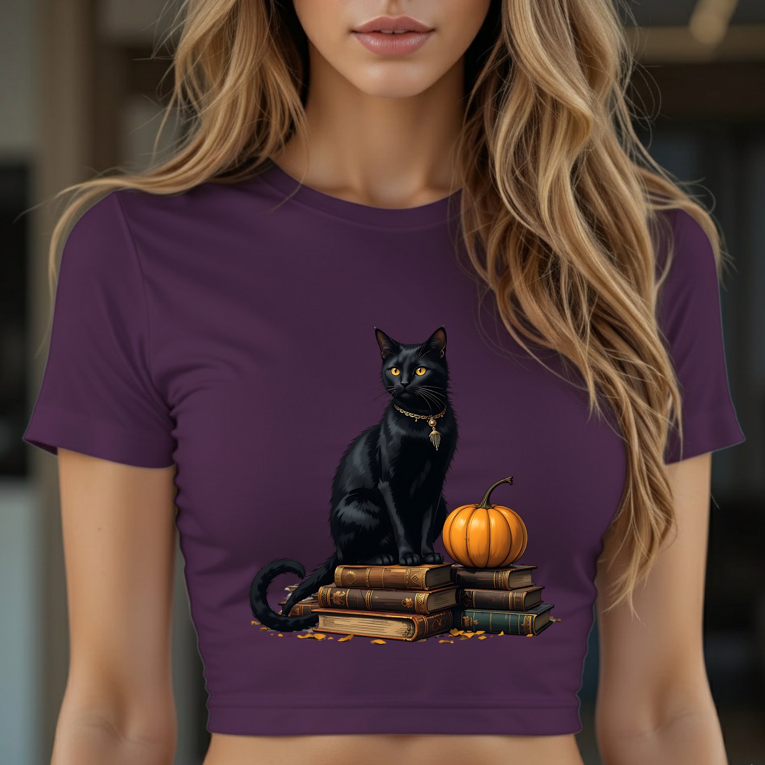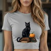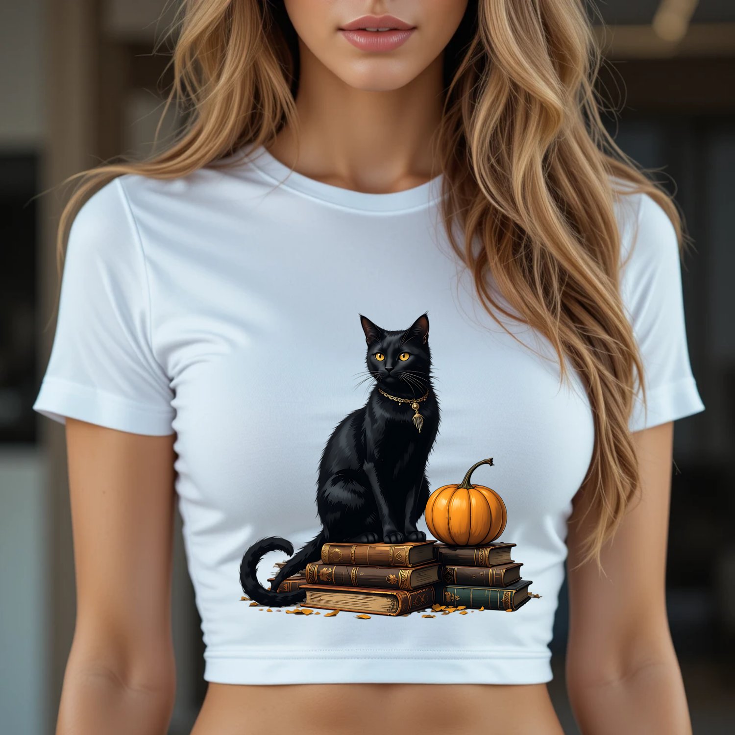Elegant digital clipart of a mystical black cat with a collar, sitting on old books and a pumpkin. Ideal for sublimation, crafting, and Halloween and fall projects.