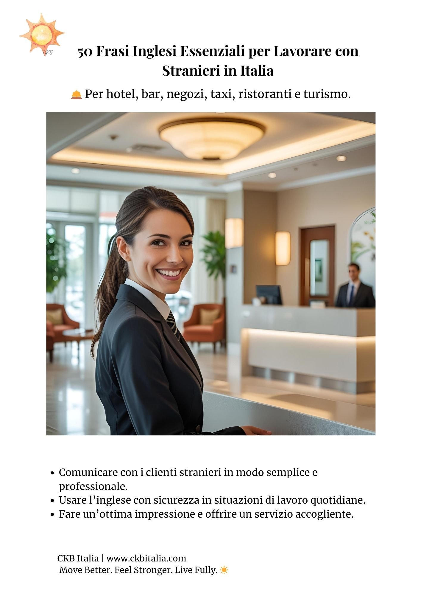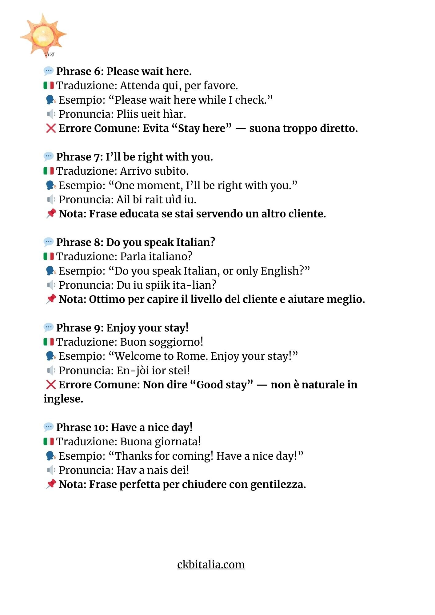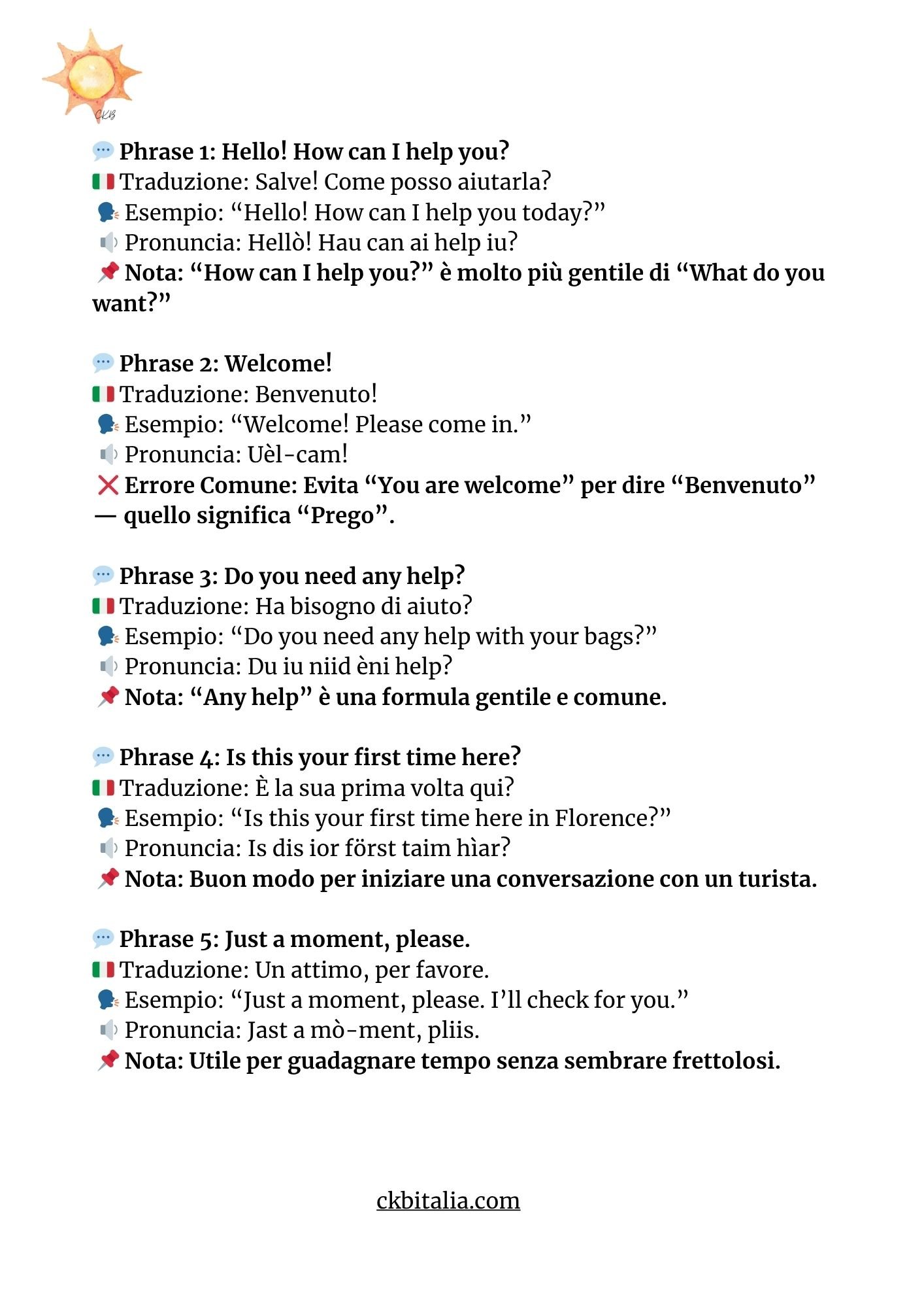 - 💬 50 frasi essenziali per il lavoro, divise per accoglienza, richieste, pagamenti, problemi, saluti