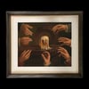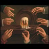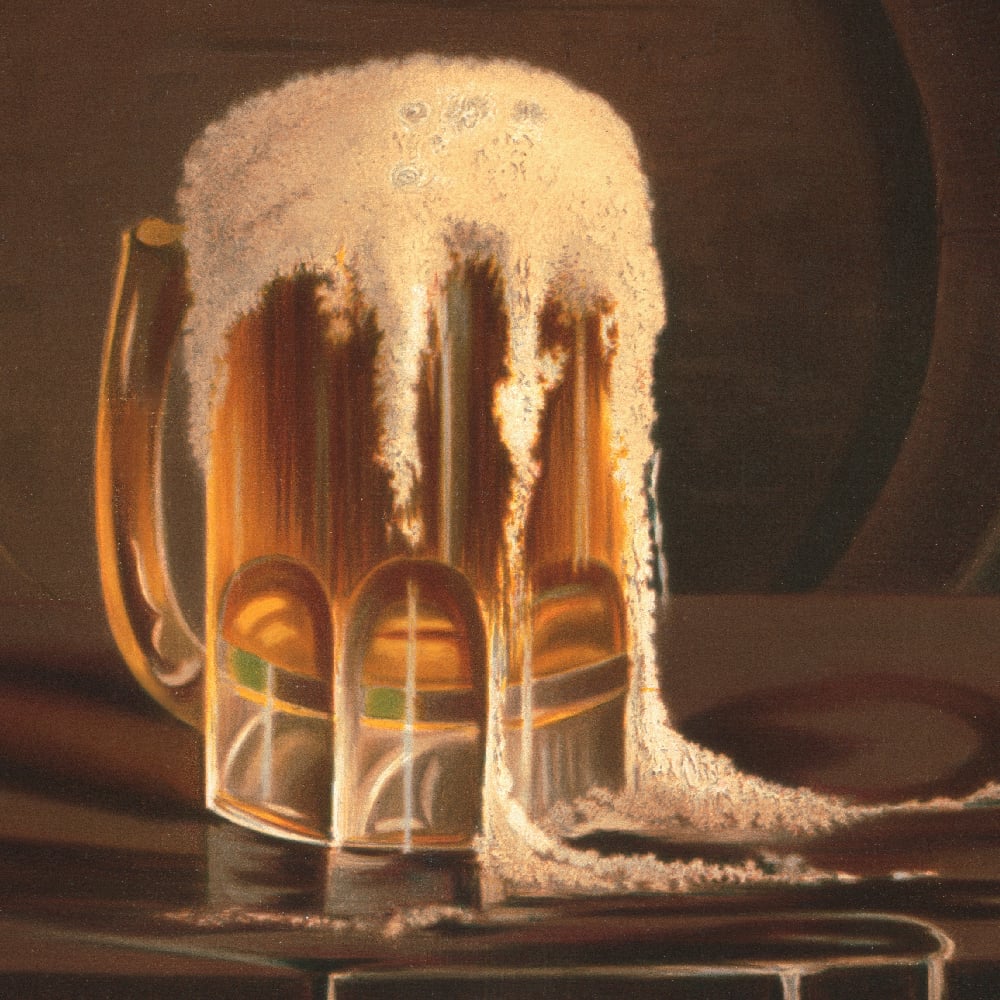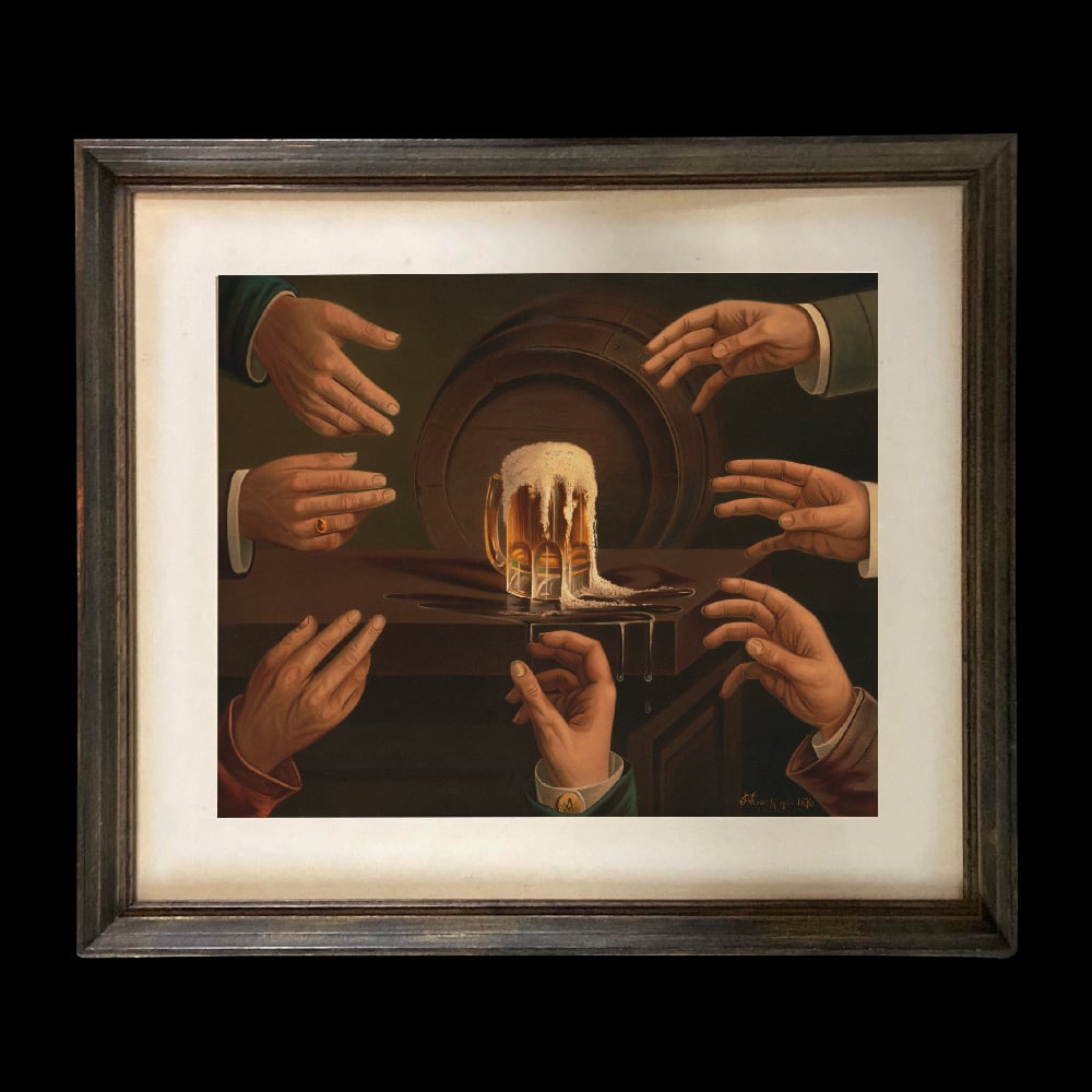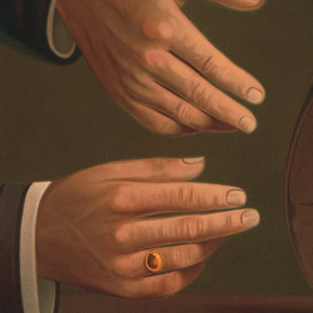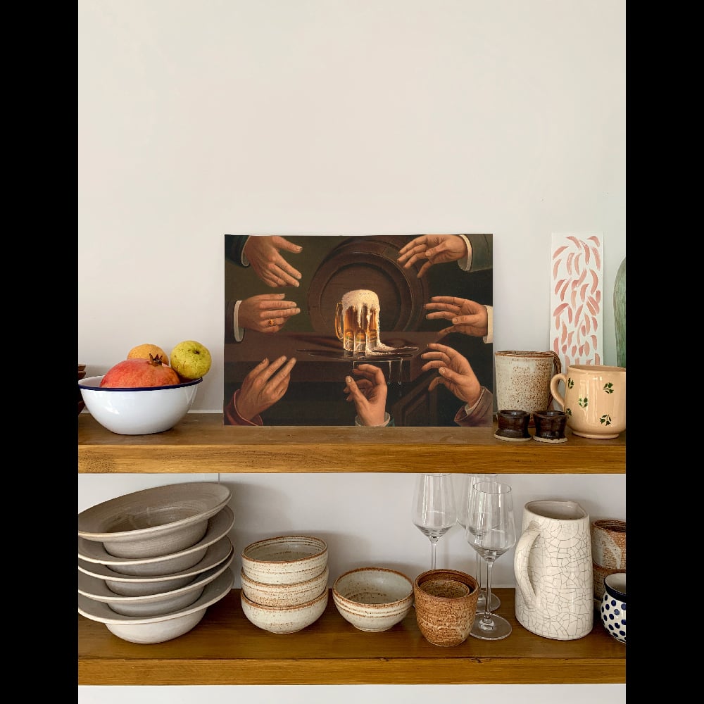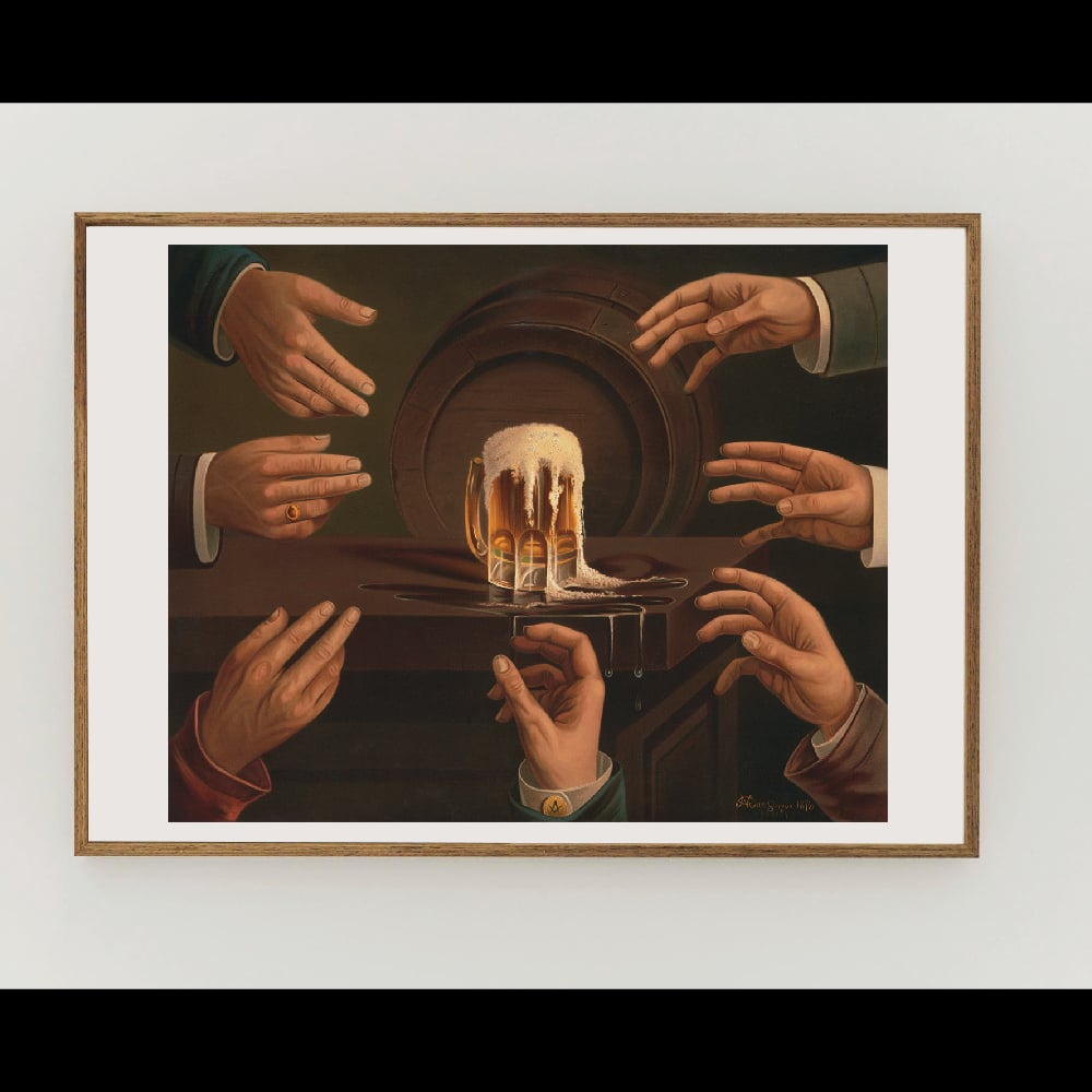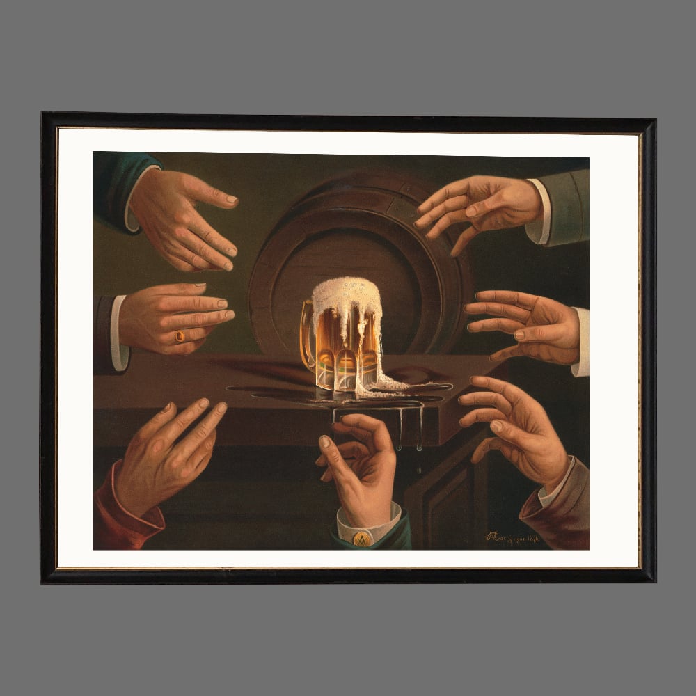 Seven male hands encircling a mug of beer, sitting on a table, one hand has a cufflink which may have the trademark of Anheuser Busch inscribed on it (1876), vintage illustration.