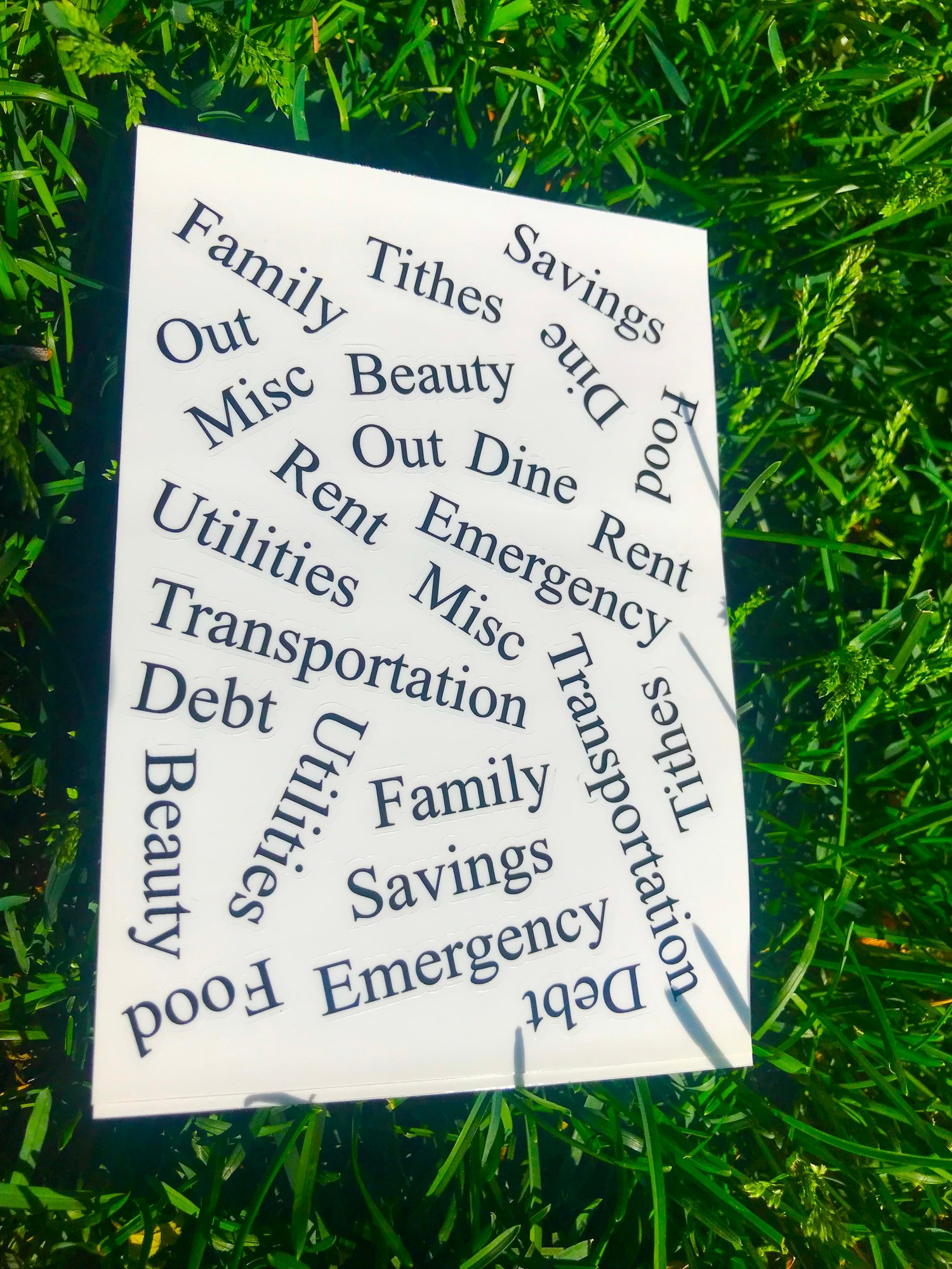 - 2 packs of pre-cut category stickers (like groceries, gas, self-care)