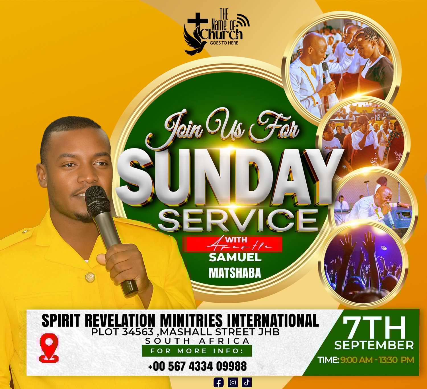 The design has a modern gospel aesthetic — energetic, welcoming, and spiritual. The mix of gold, yellow, and green gives it a vibrant and divine feel, fitting for a Sunday worship invitation.