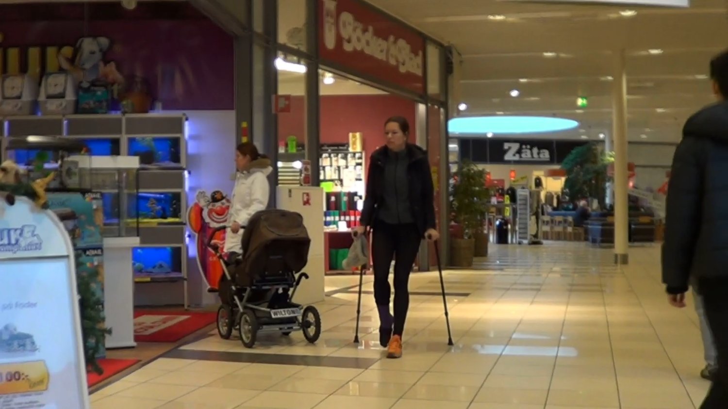 Sanne is crutching from the parking in to a Mall.She has a black sock over her toes of her casted leg but when she sits down for a arest she removes the sock for a minute and wiggling her toes for us